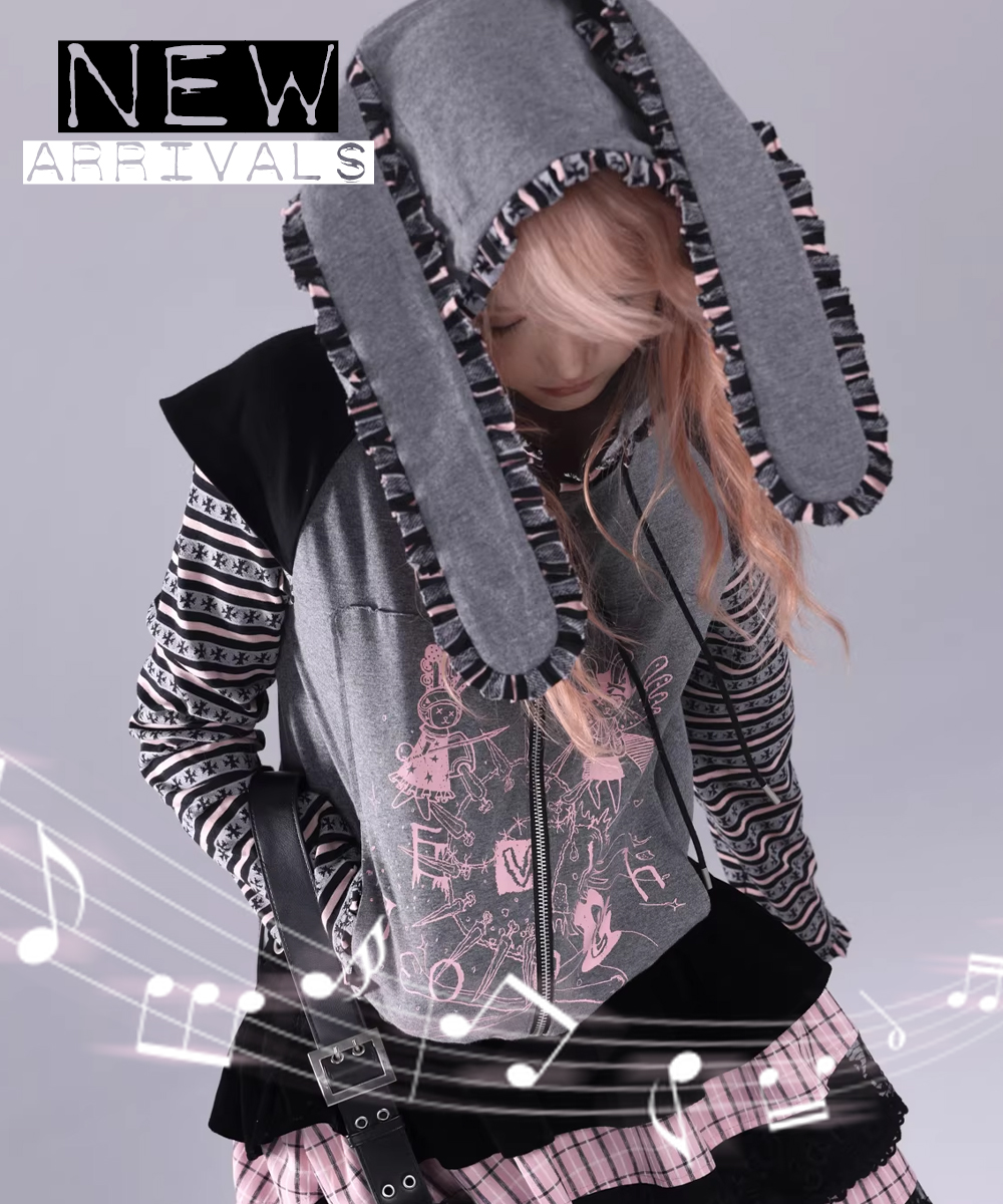 Artículo original Evil ToothChaqueta de manga larga fina con cierre frontal con cremallera.Tiene orejitas de conejito en la capucha.85% algodón, 25% poliéster.