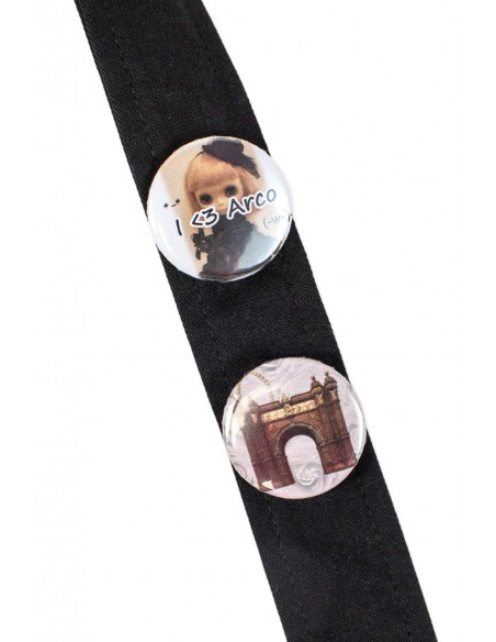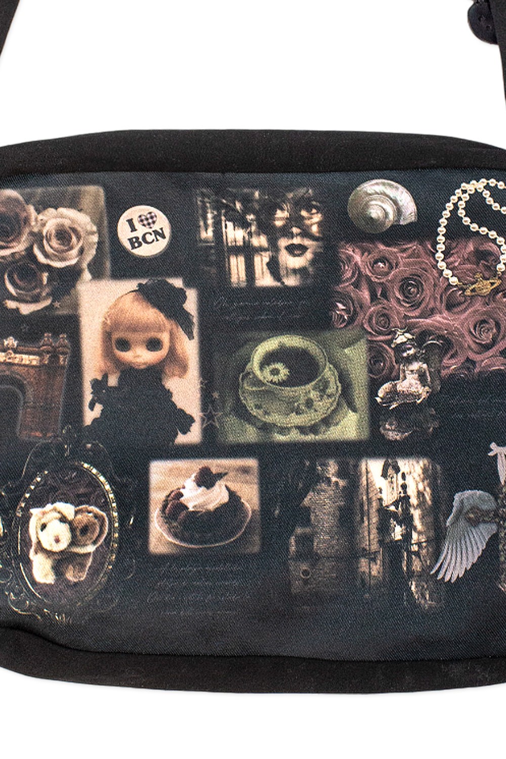 Messenger bag. Made of digitally printed fabric, adorned with charms, and includes two matching badges.