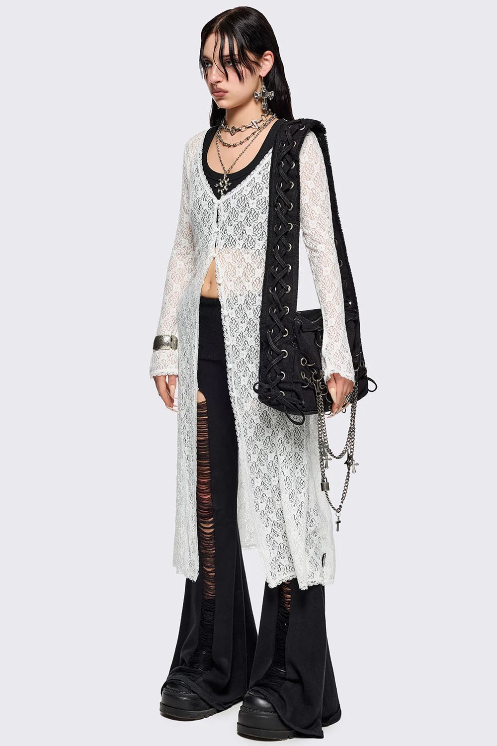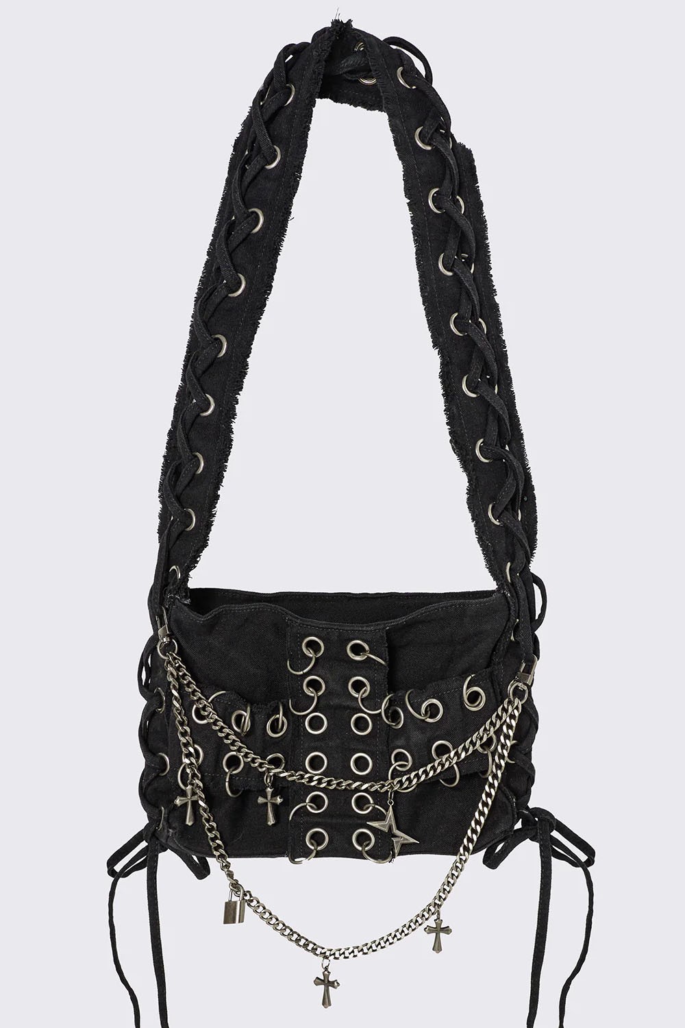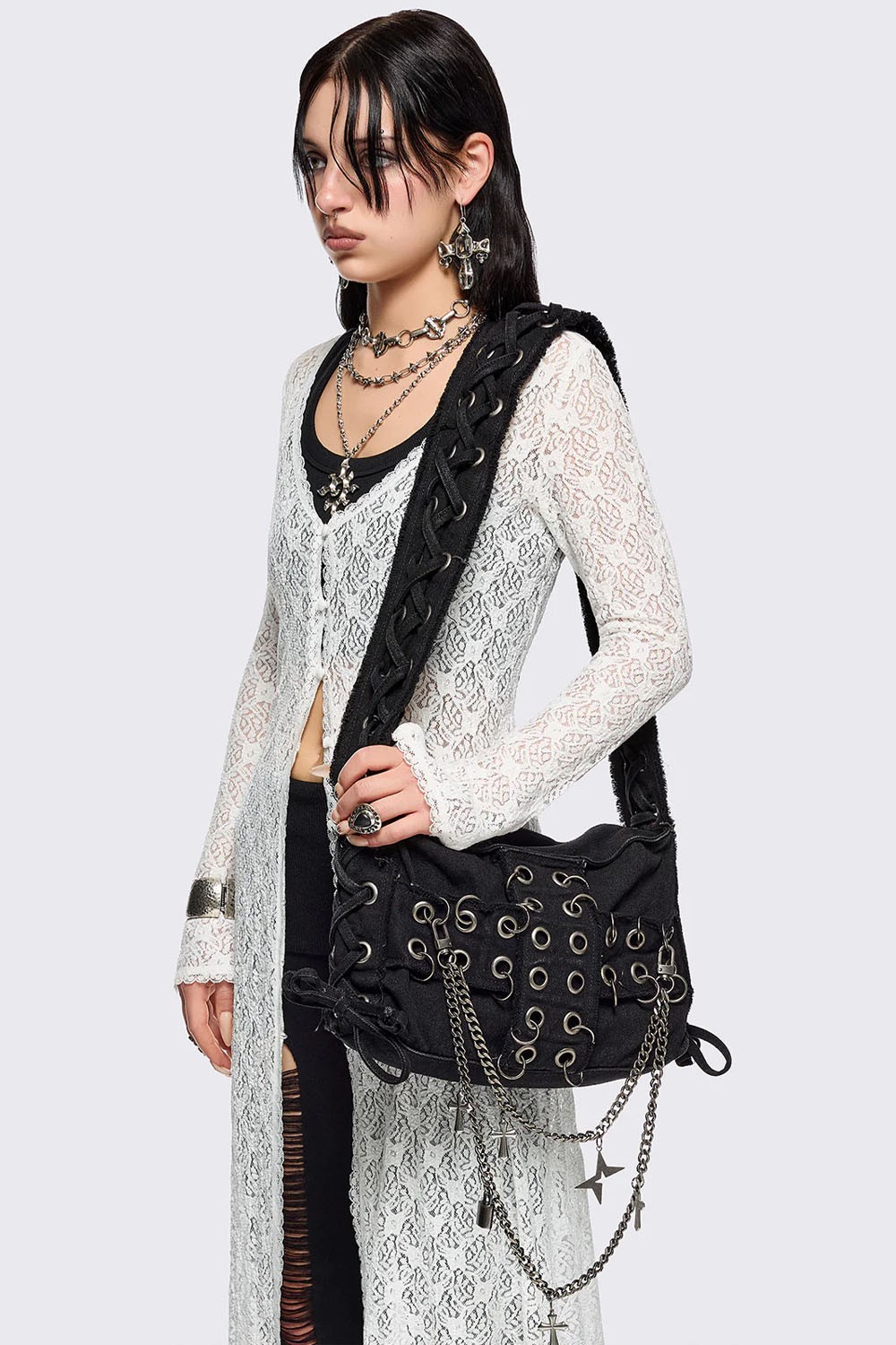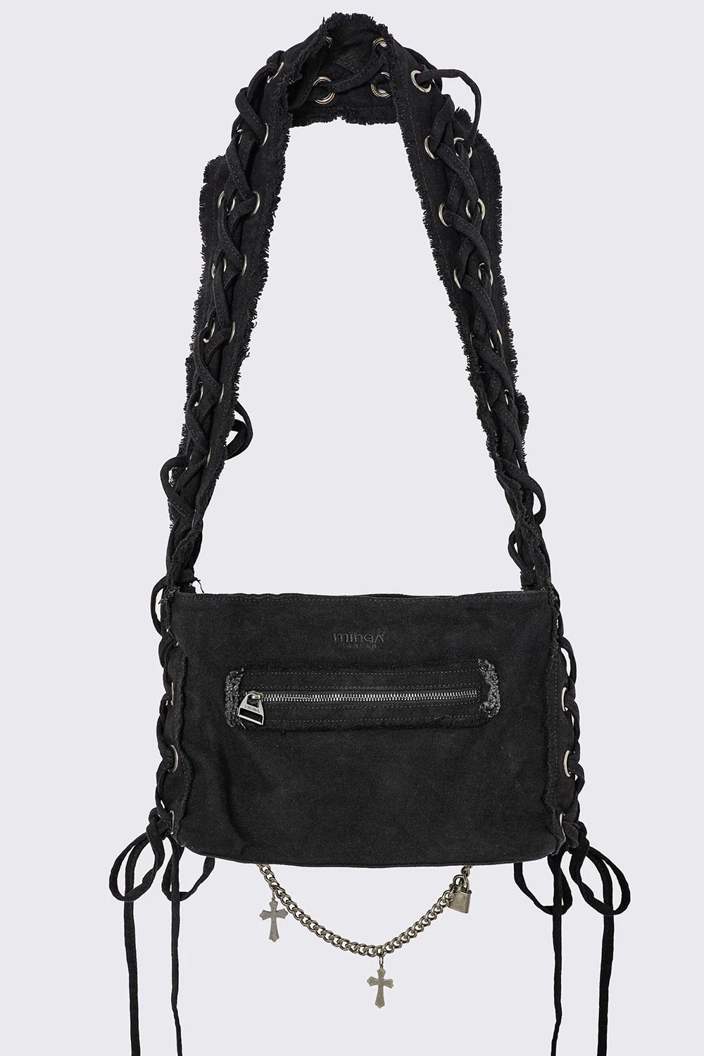 Bag adorned with chains. Includes long and short shoulder straps.With interior pockets. Zipper closure.