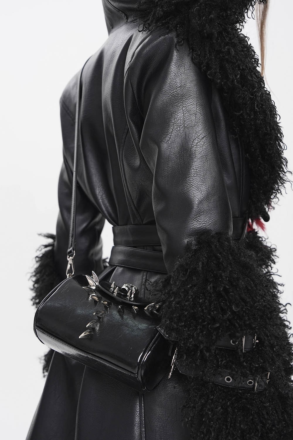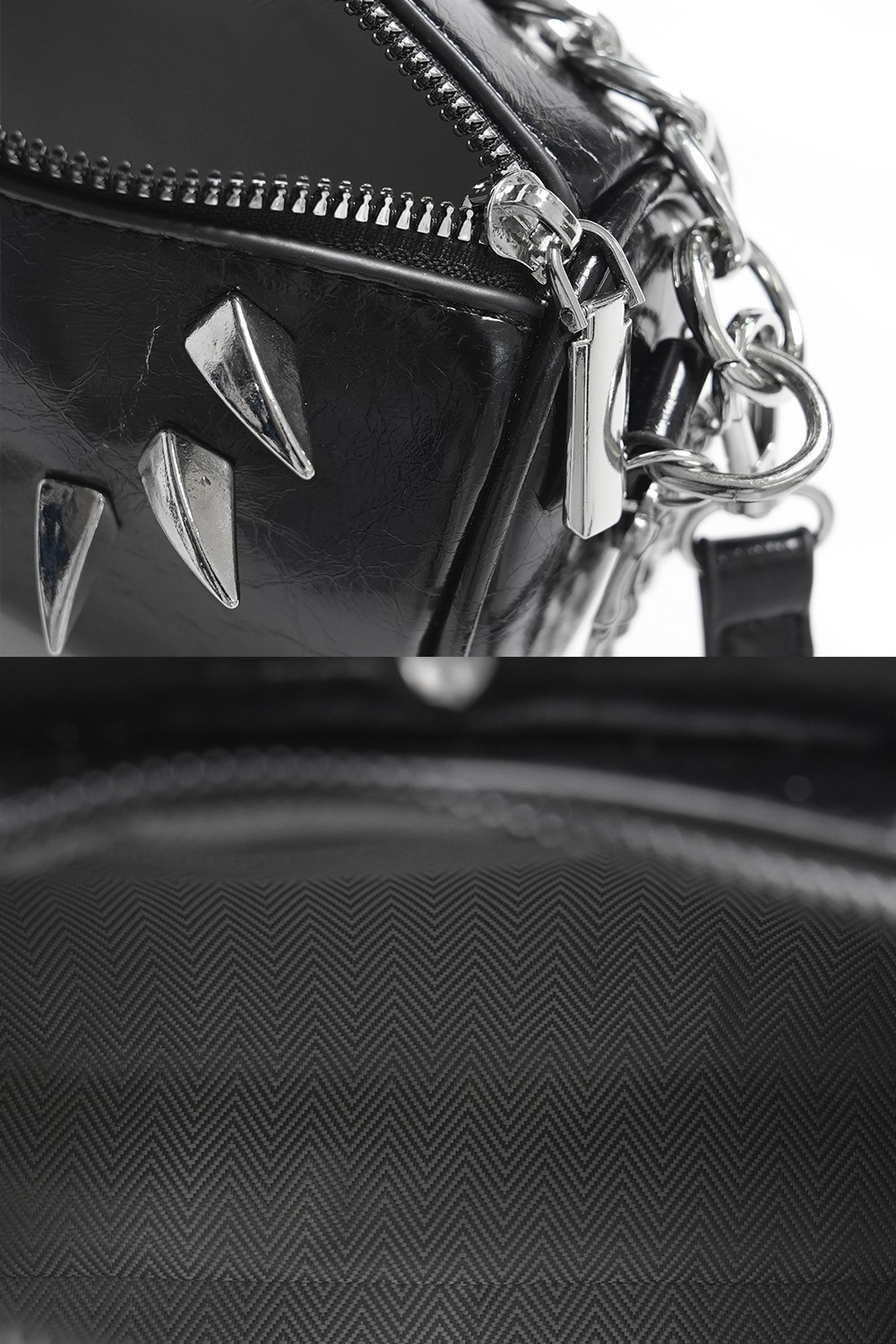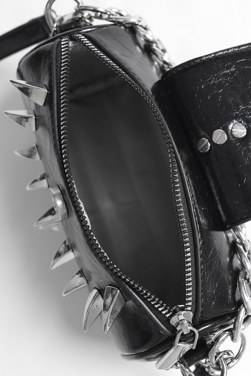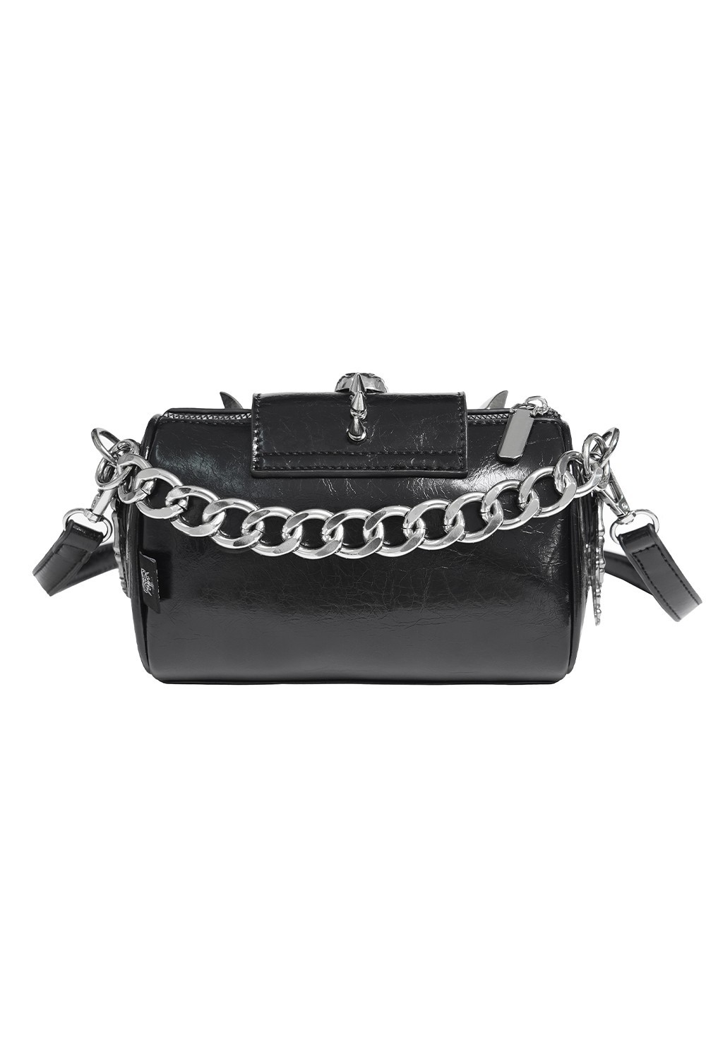 Mini bag with removable adjustable strap, chain, and spike and skull details.