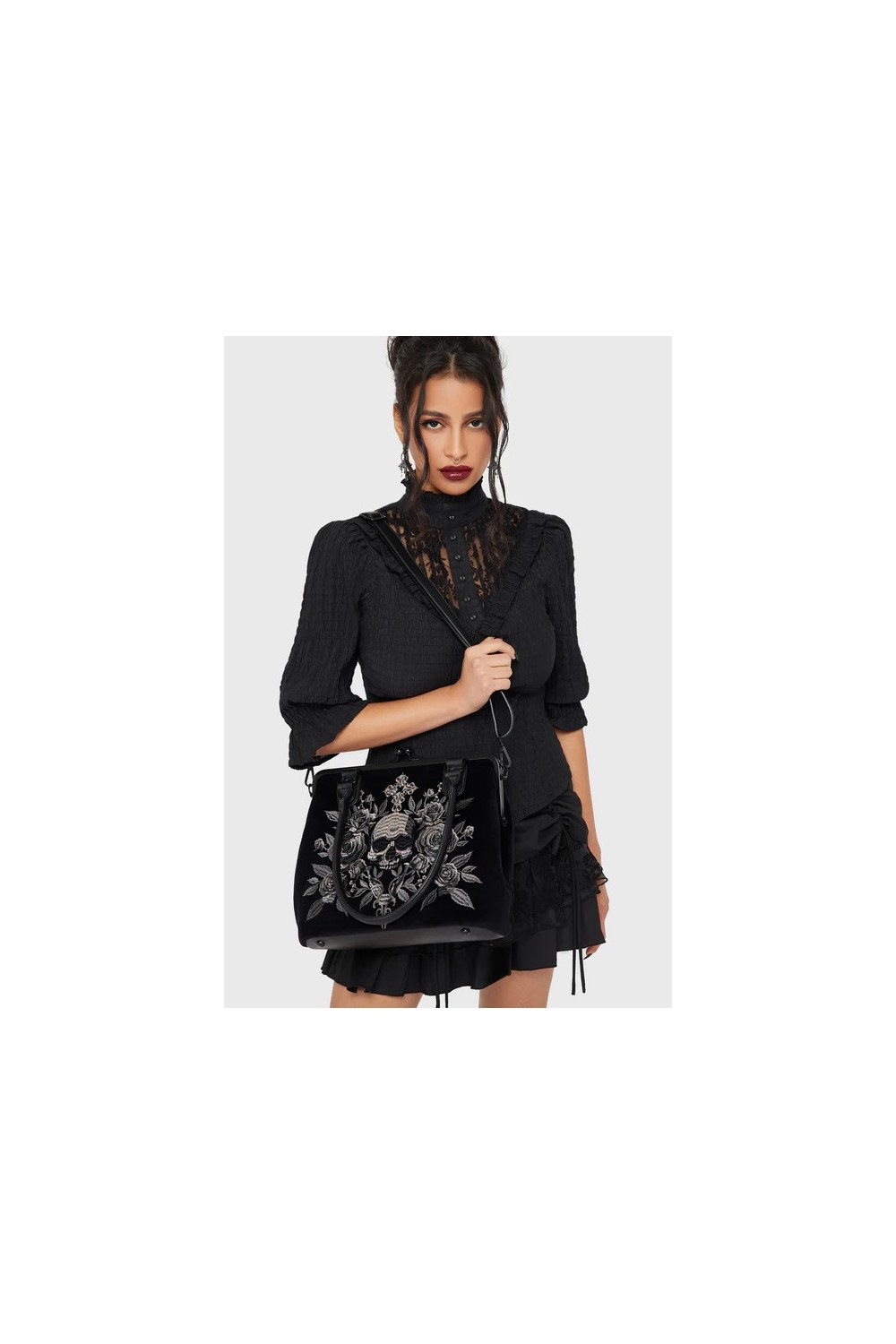 Velvet handbag with embroidered skull on the front.