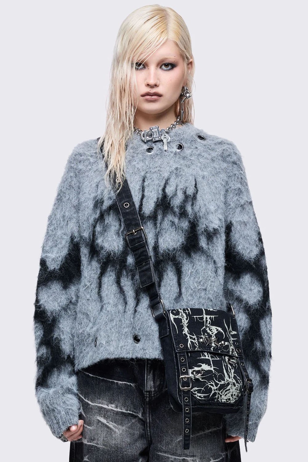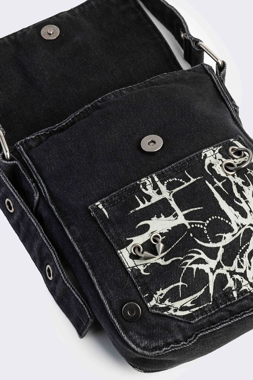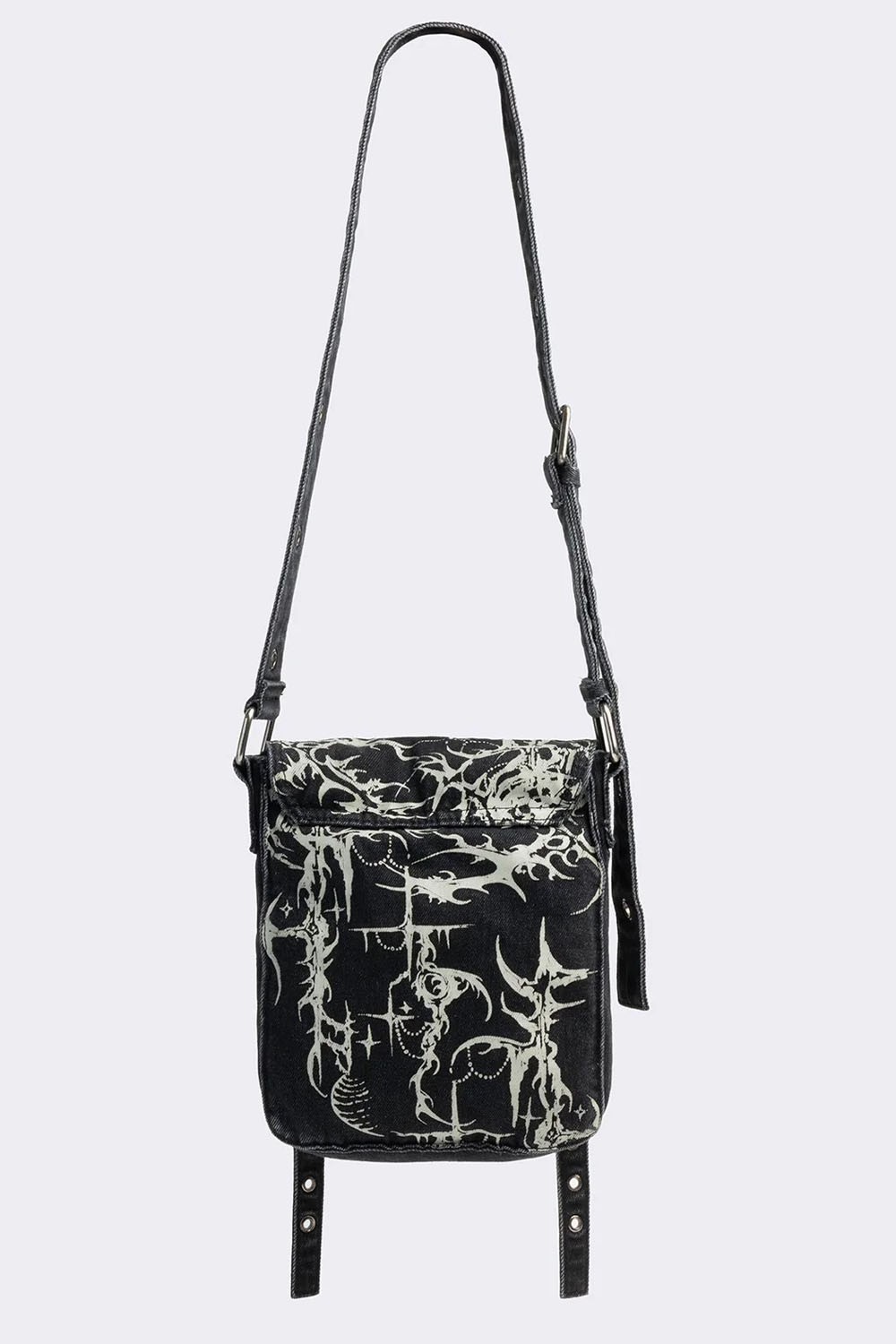 Denim bag with neotribal motif.