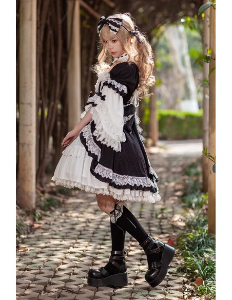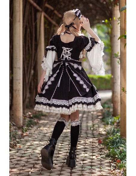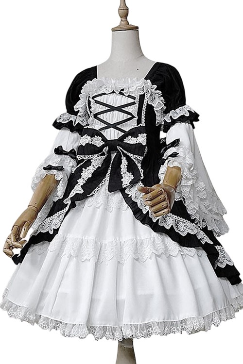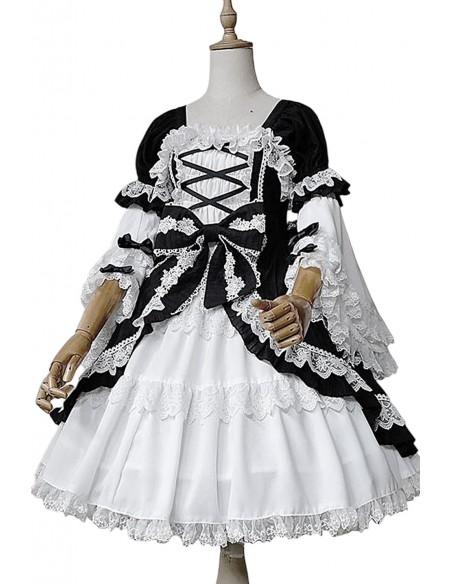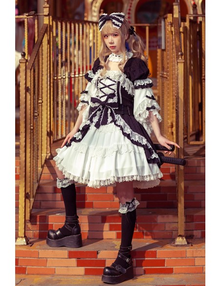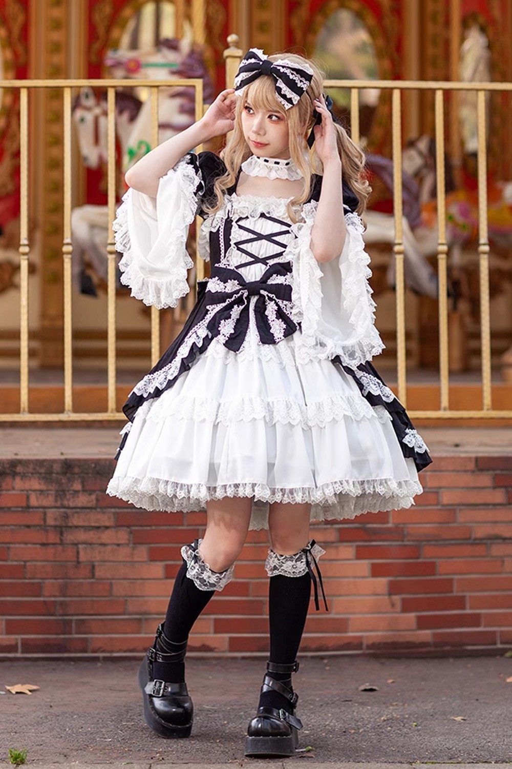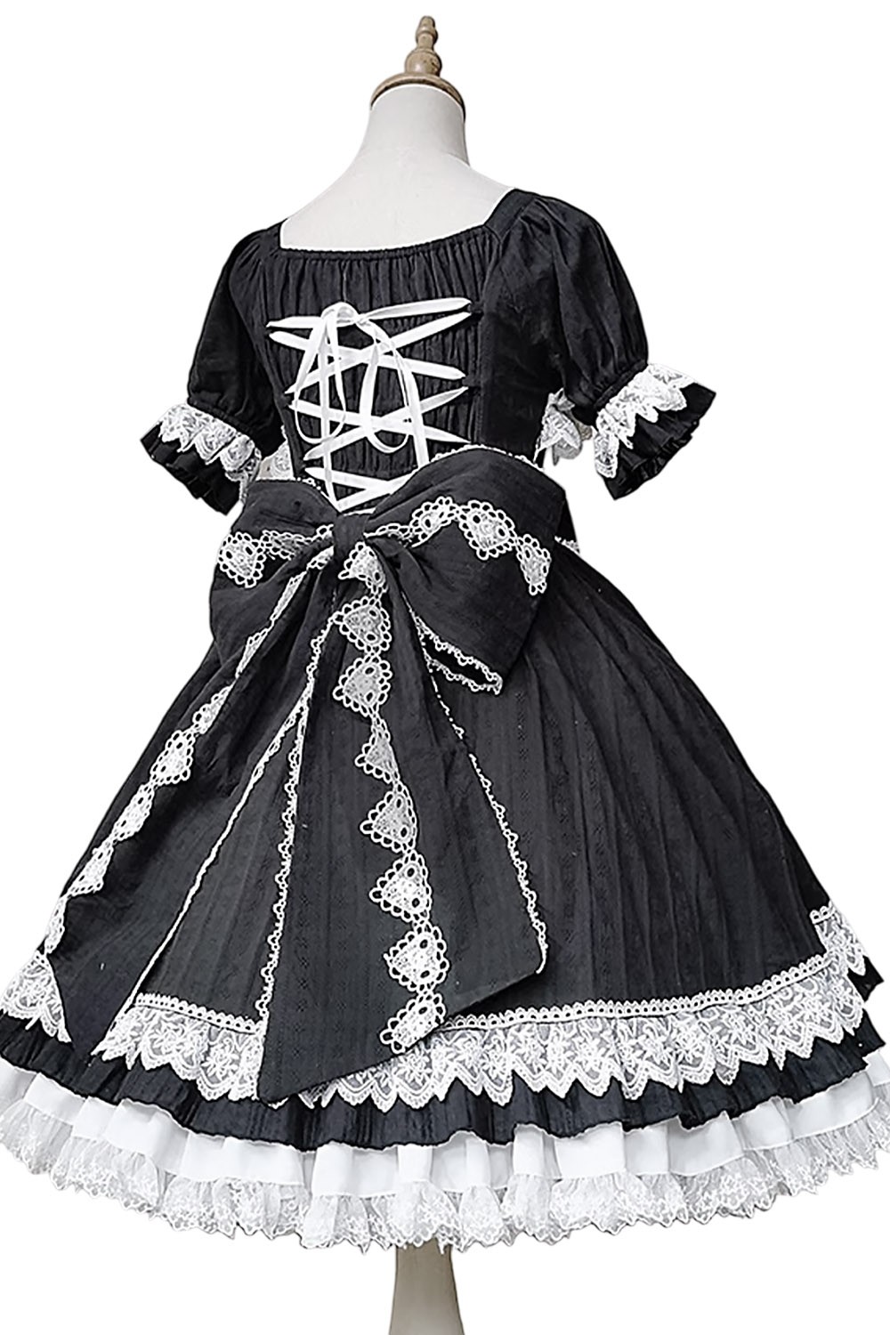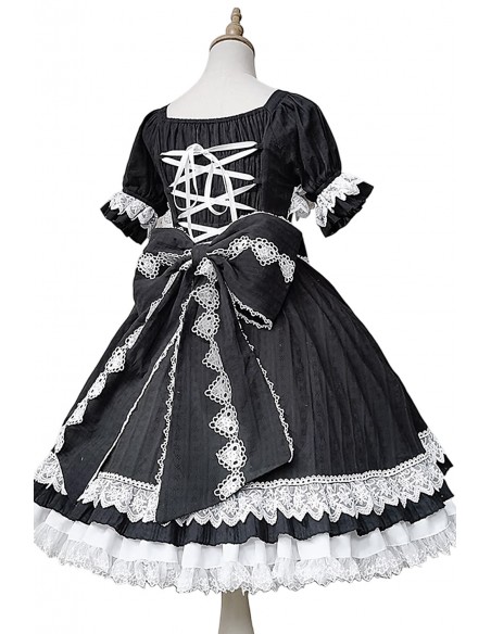 Short-sleeved cotton dress. Adorned with lace, ruffles and a large bow at the back. Elastic back and adjustable straps at the back.