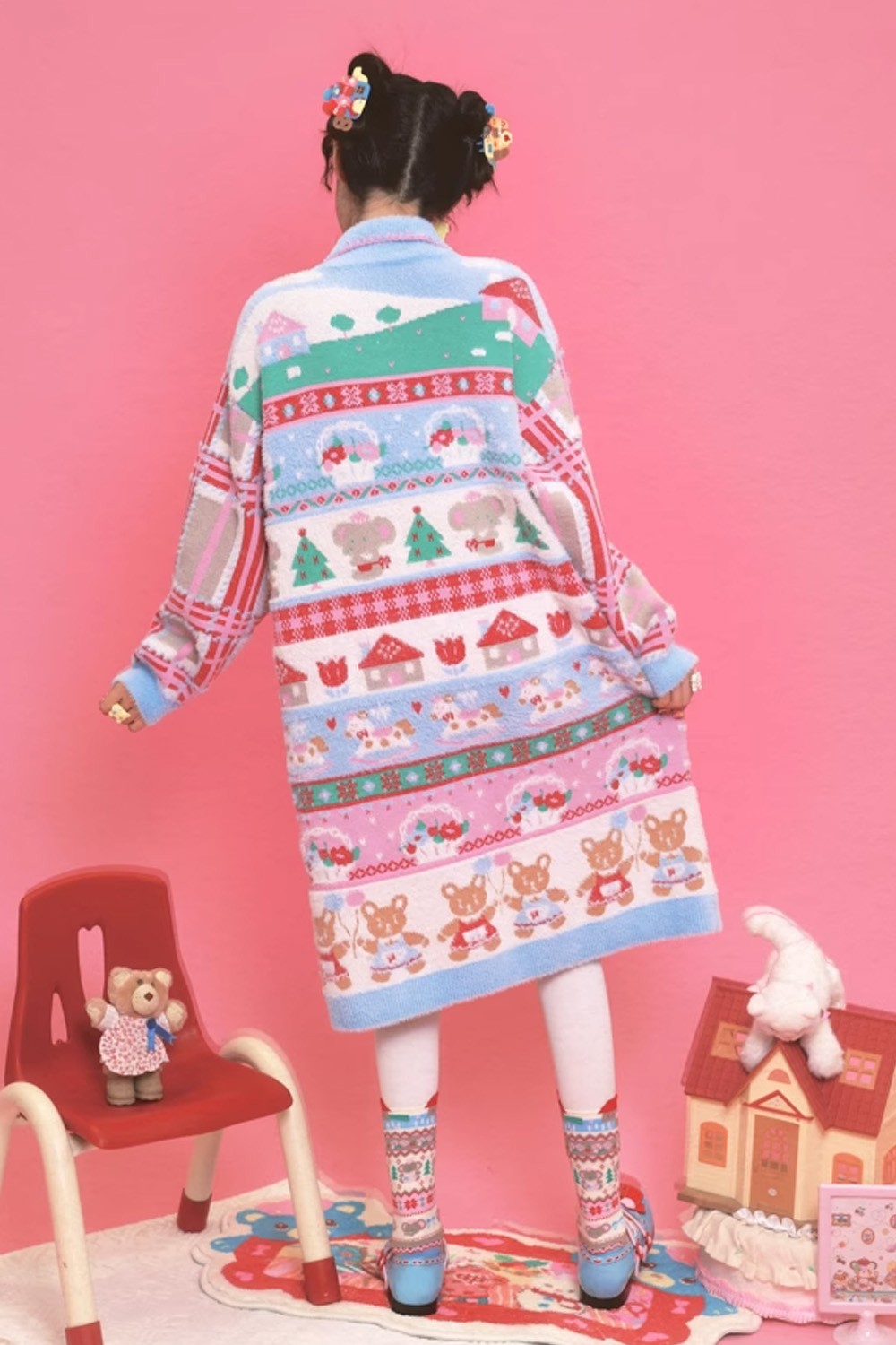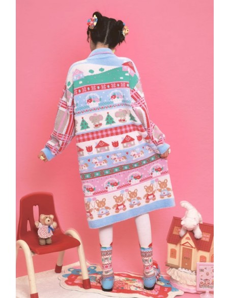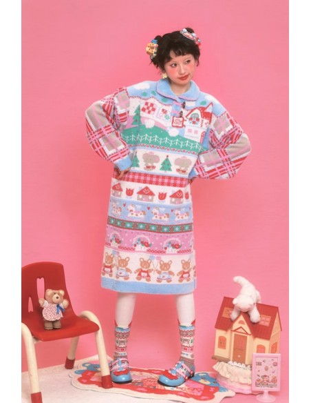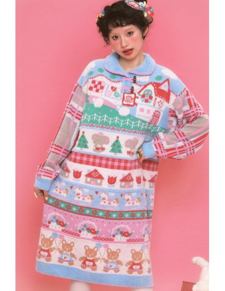 Oversized knit dress with a pattern, a baby collar, and two top buttons.