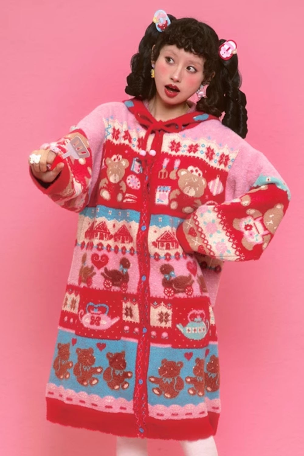 Oversized knit dress with graphic knits, front buttons, and hood.