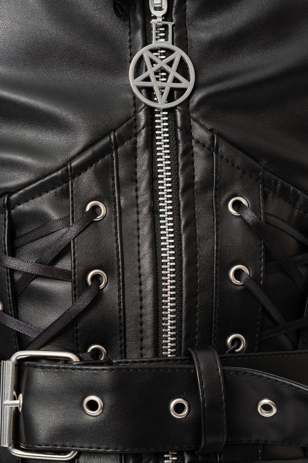 Faux leather slip dress with front zipper.