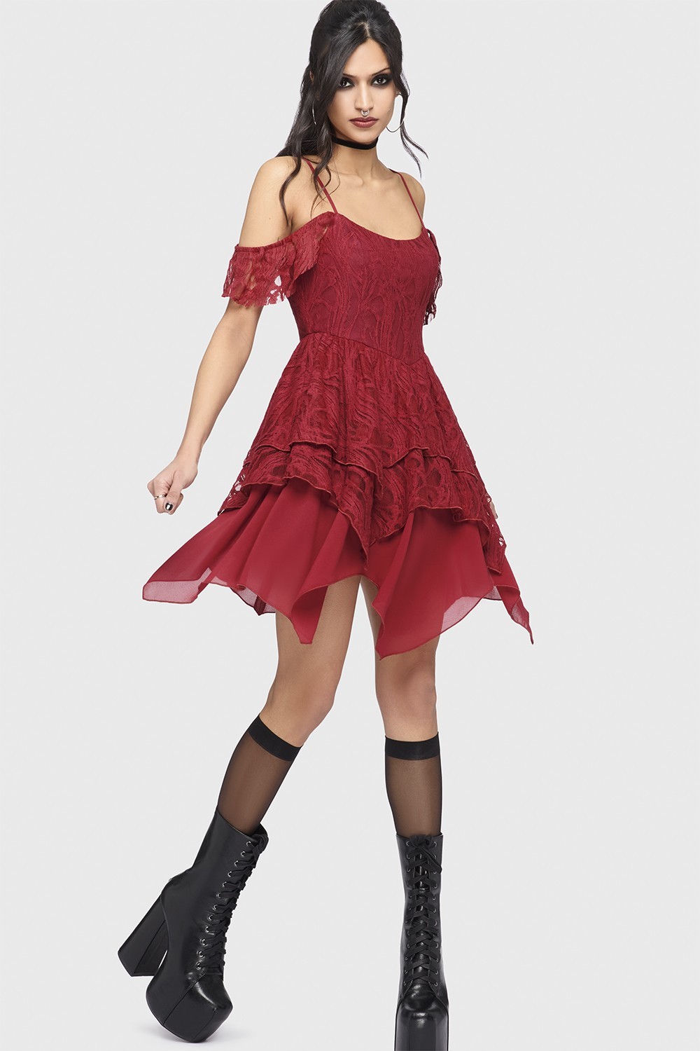 Off-the-shoulder dress with adjustable ties and multiple layers of lace.
