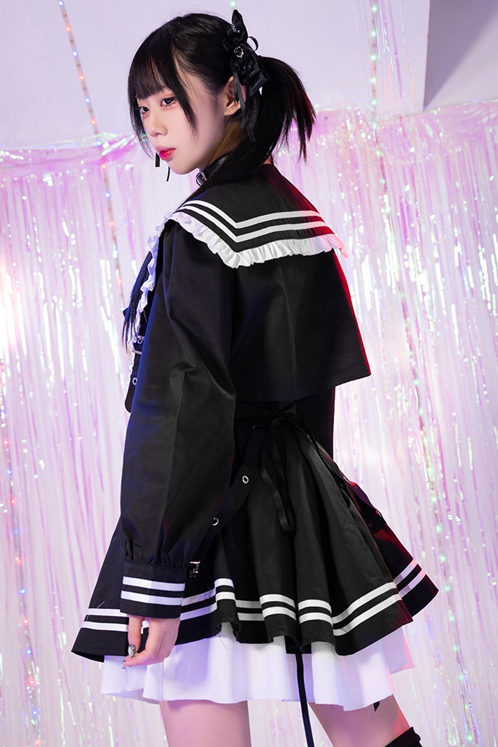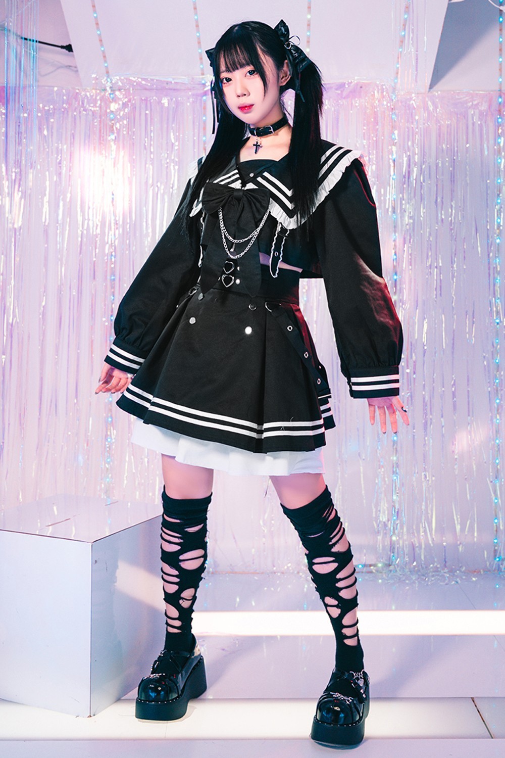 2-Piece Set: Seifuku Top + Skirt Dark Night Sweetheart in Black x White - Jill Punk