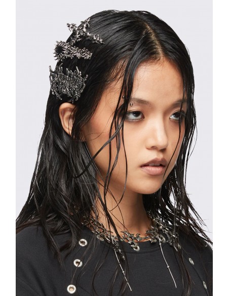 Set of 3 hair clips with heart, cross, and neotribal lettering motifs.