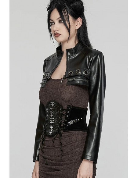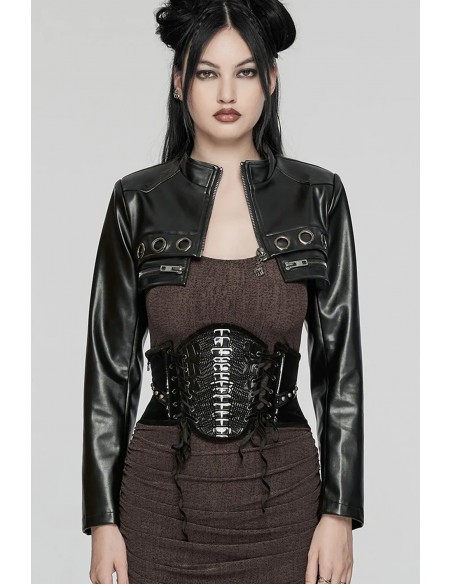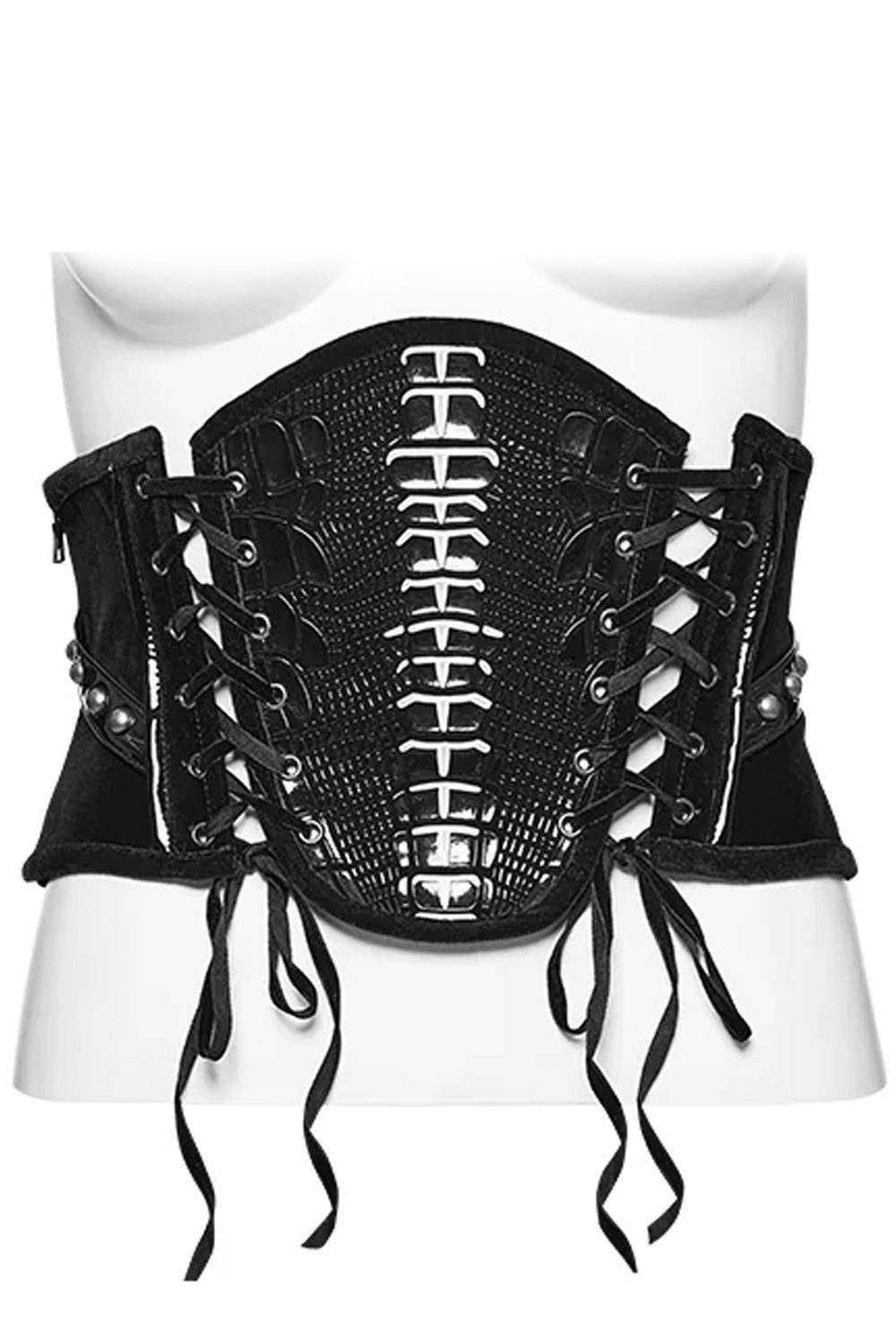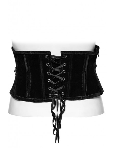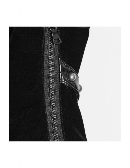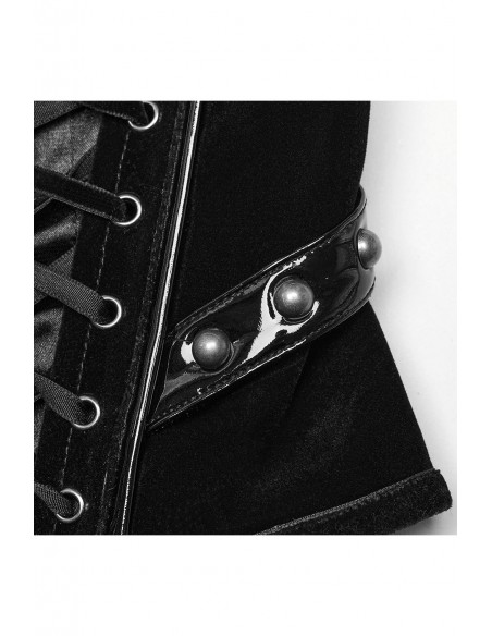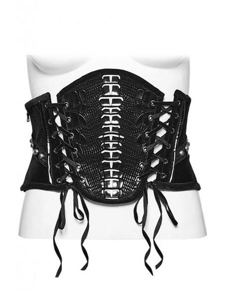 Velvet and faux leather corset decorated with laces and vinyl pieces. Adjustable straps and side zipper.