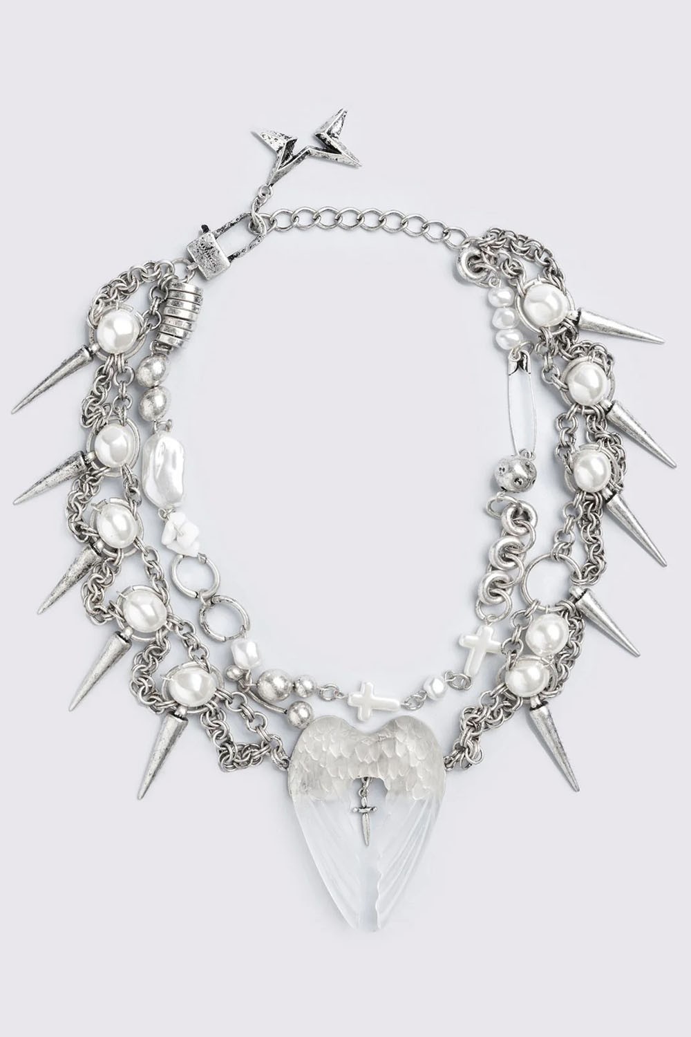 Multi-layered necklace with spikes and synthetic pearls, featuring an angel wing charm on the front.