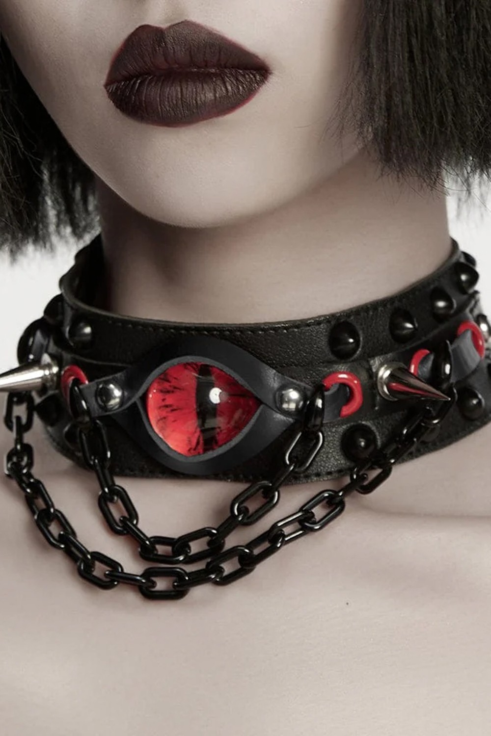Choker with a central eyelet, spikes, and chains.