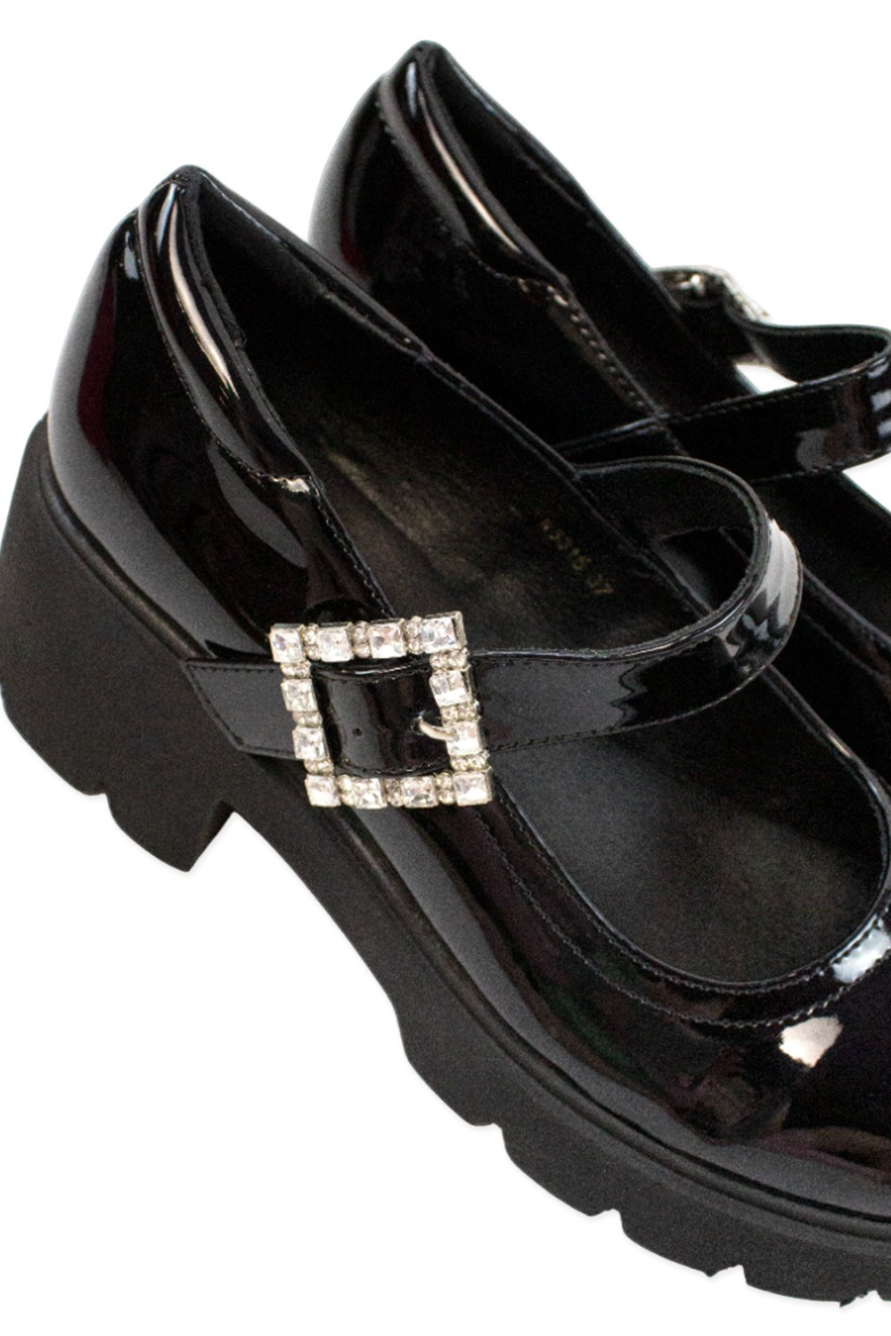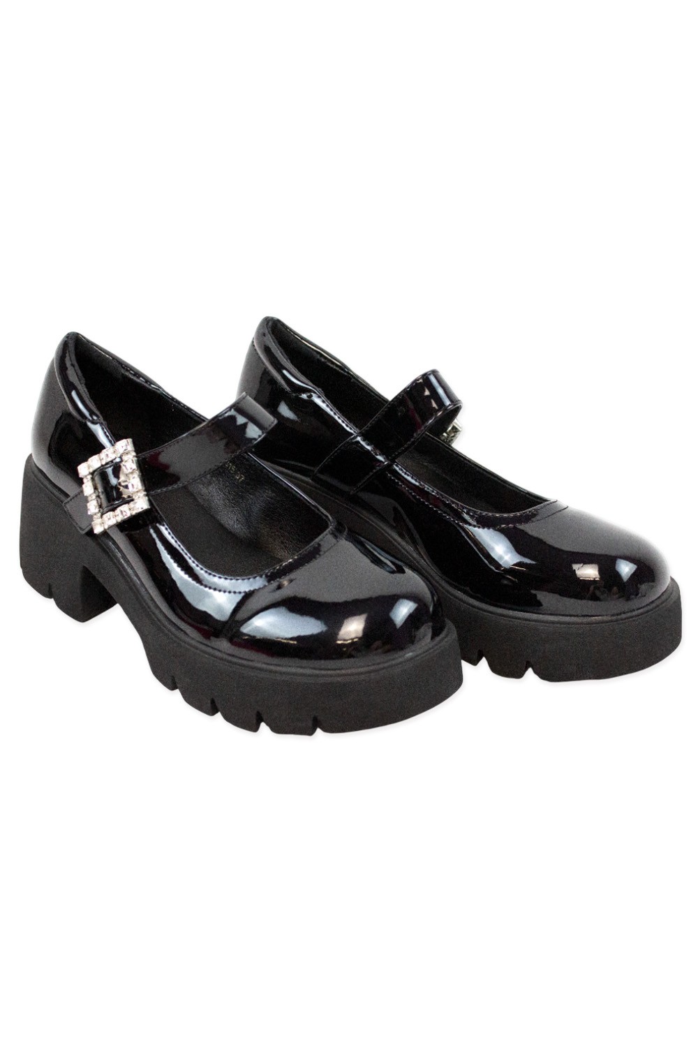 Lightweight patent PU leather Mary Jane shoe with a heel and a rhinestone buckle.