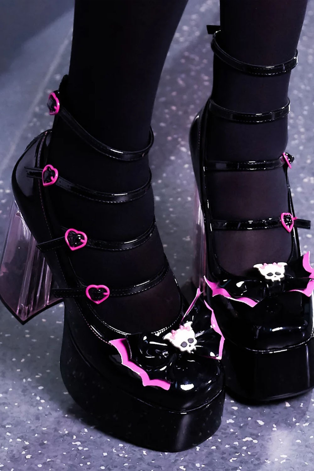 The heel is made of clear glitter and filled with mini bats.
