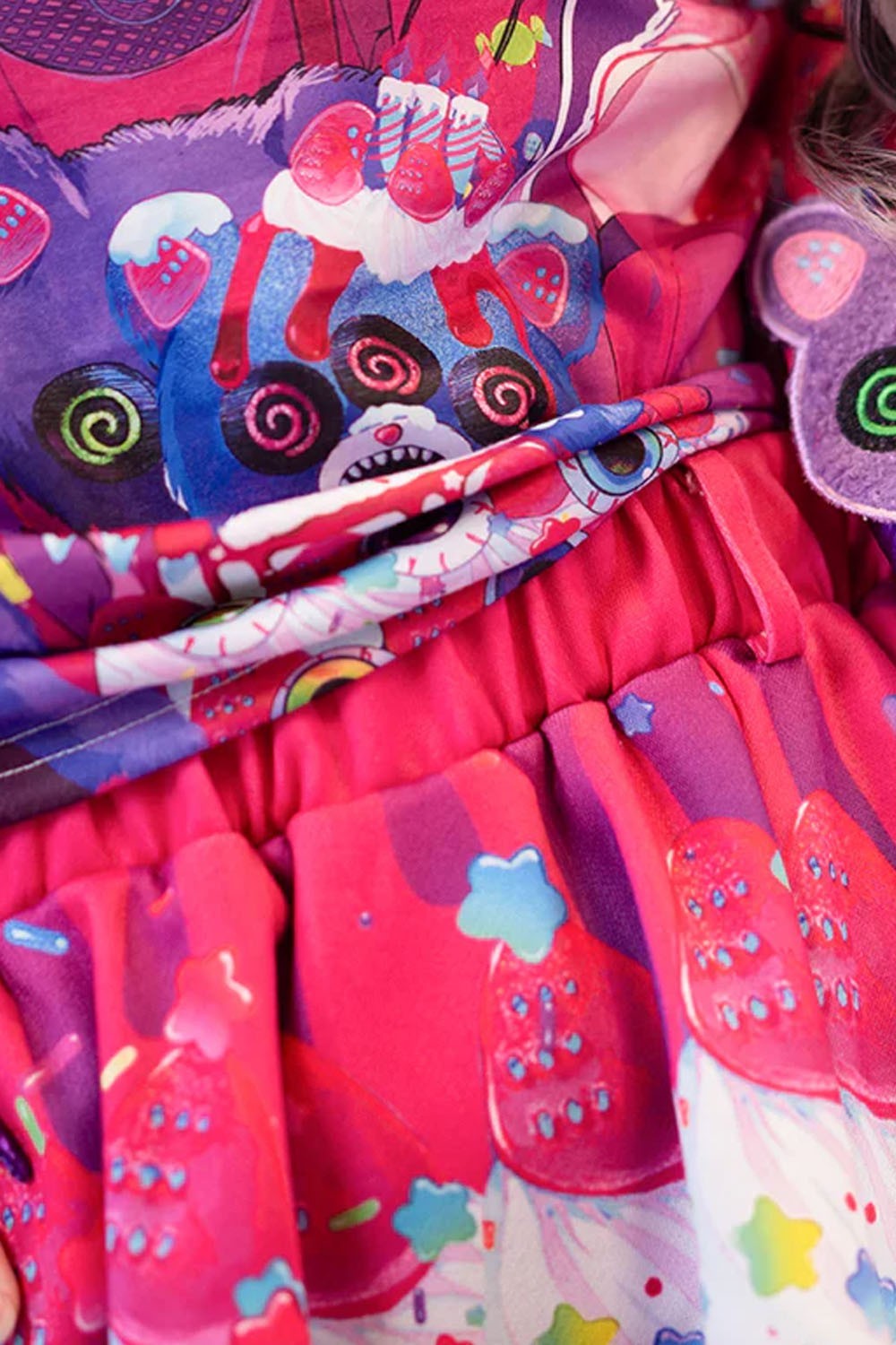 Skirt with a digital print featuring a cake and eyes motif.