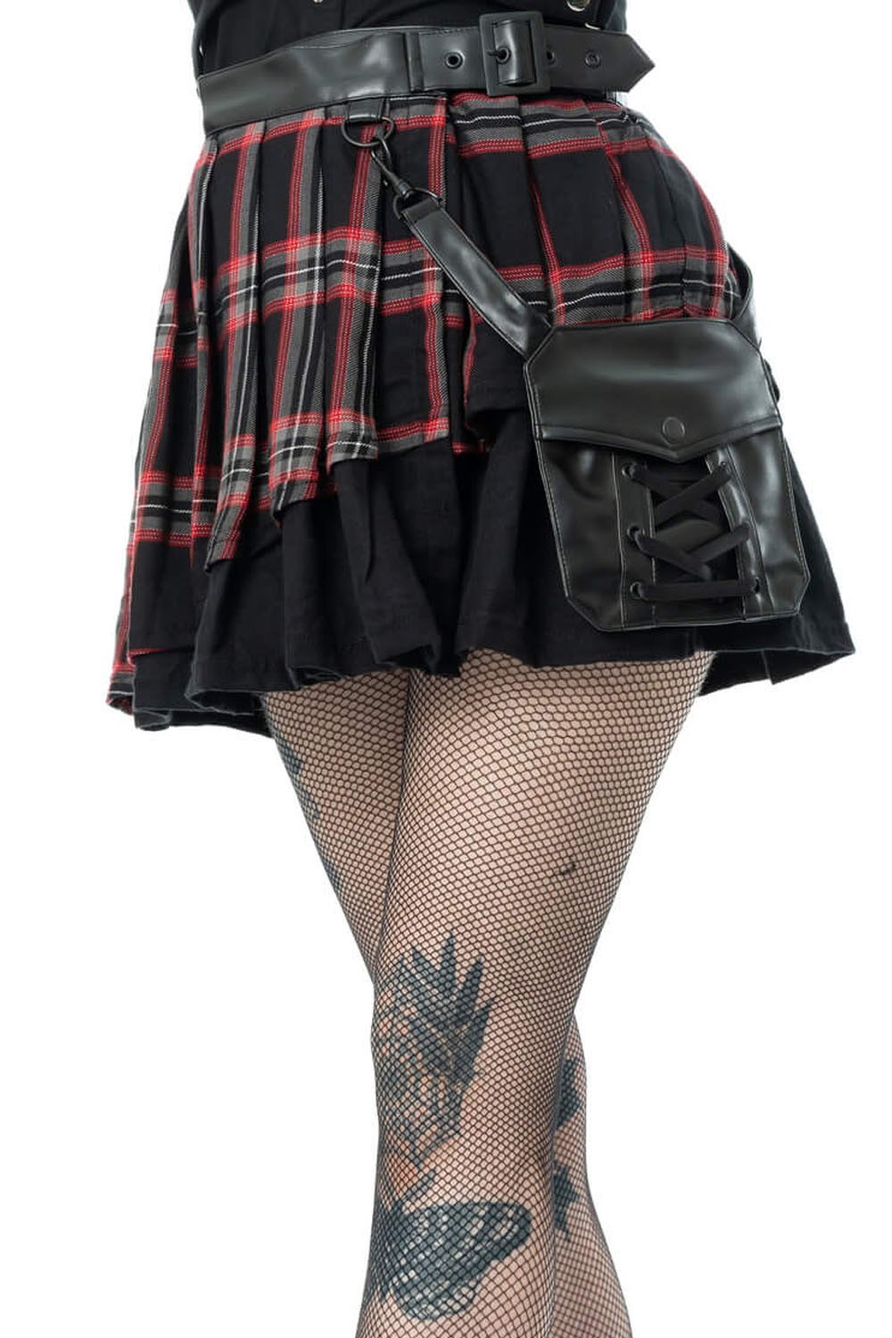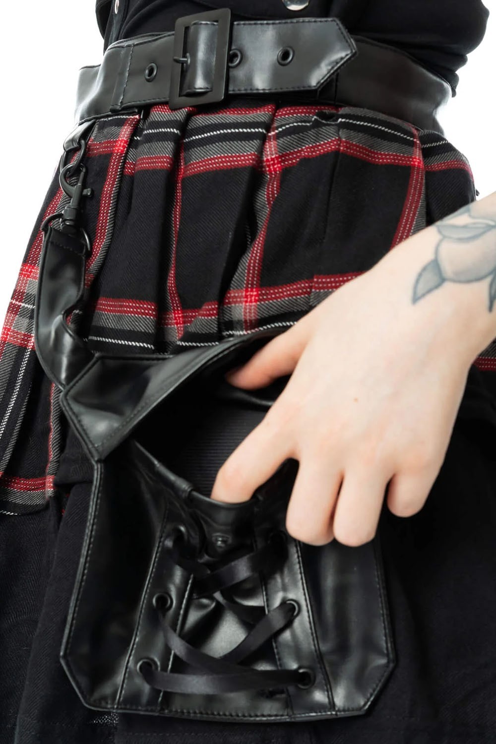 Tartan skirt with an exterior compartment and functional pocket.