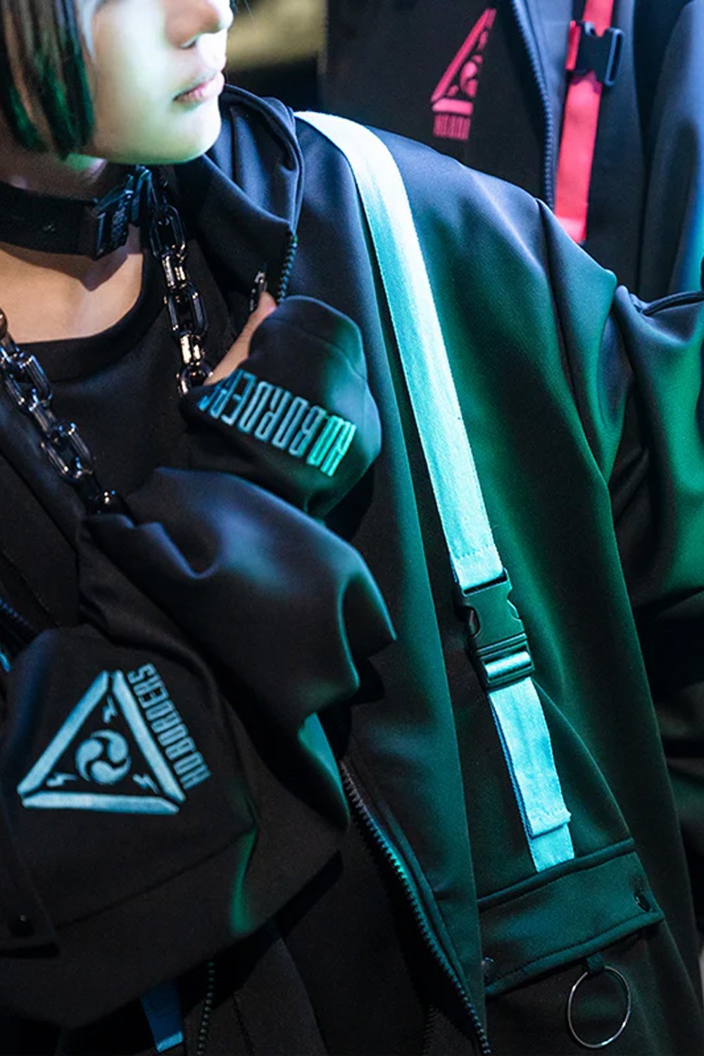 Oversized jacket with neon stripes, multiple functional pockets, and sleeve embroidery.
