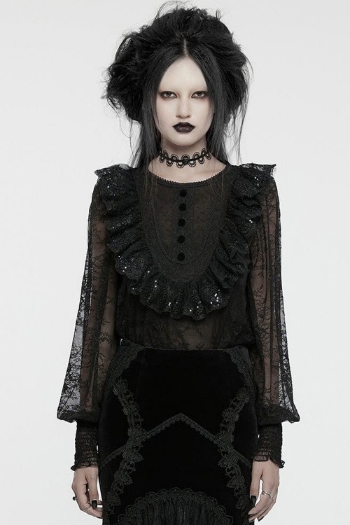 Semi-transparent black soft lace blouse with ruffled collar with small sequins.