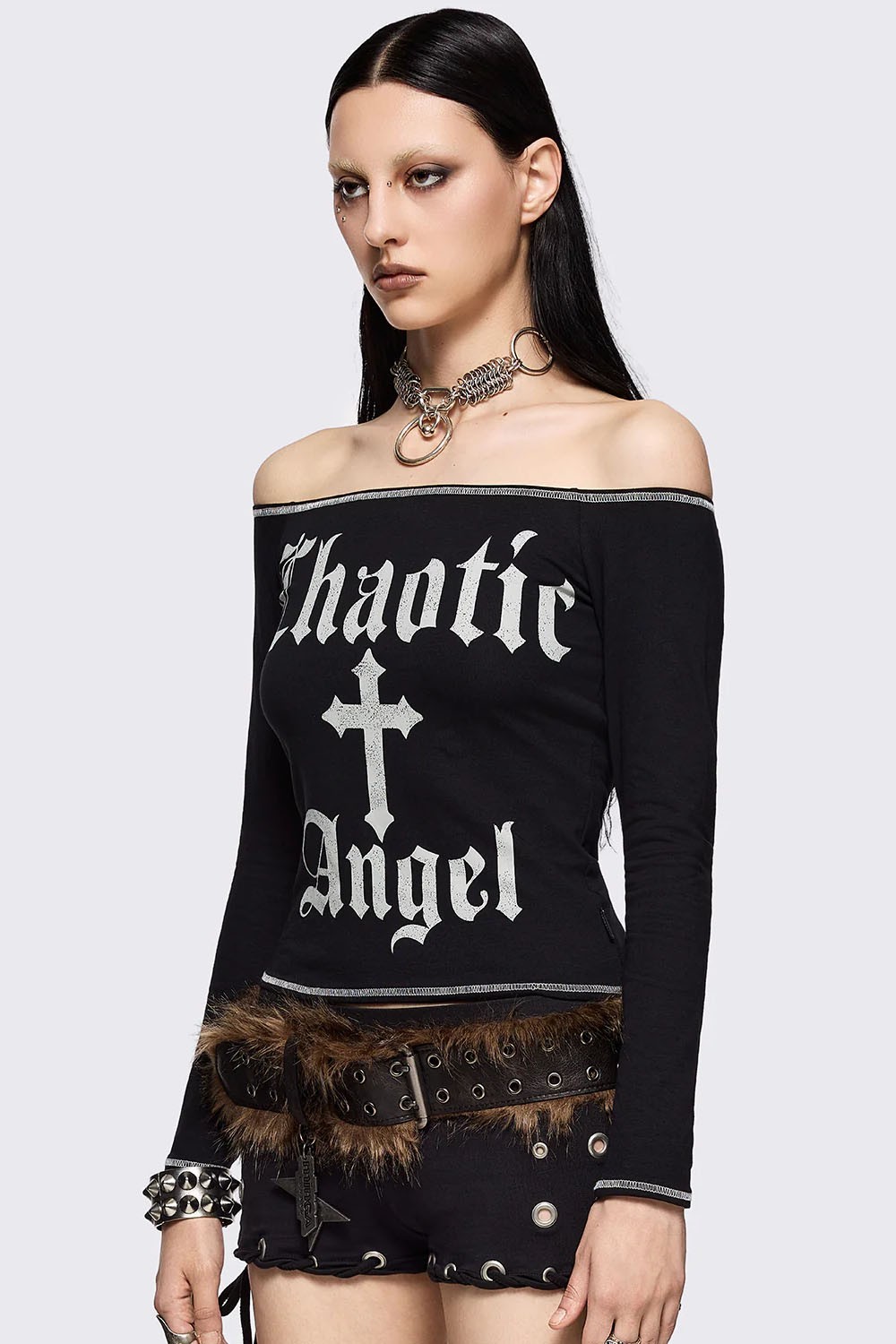 Off-the-shoulder long-sleeved top with a cross and letter print on the front.