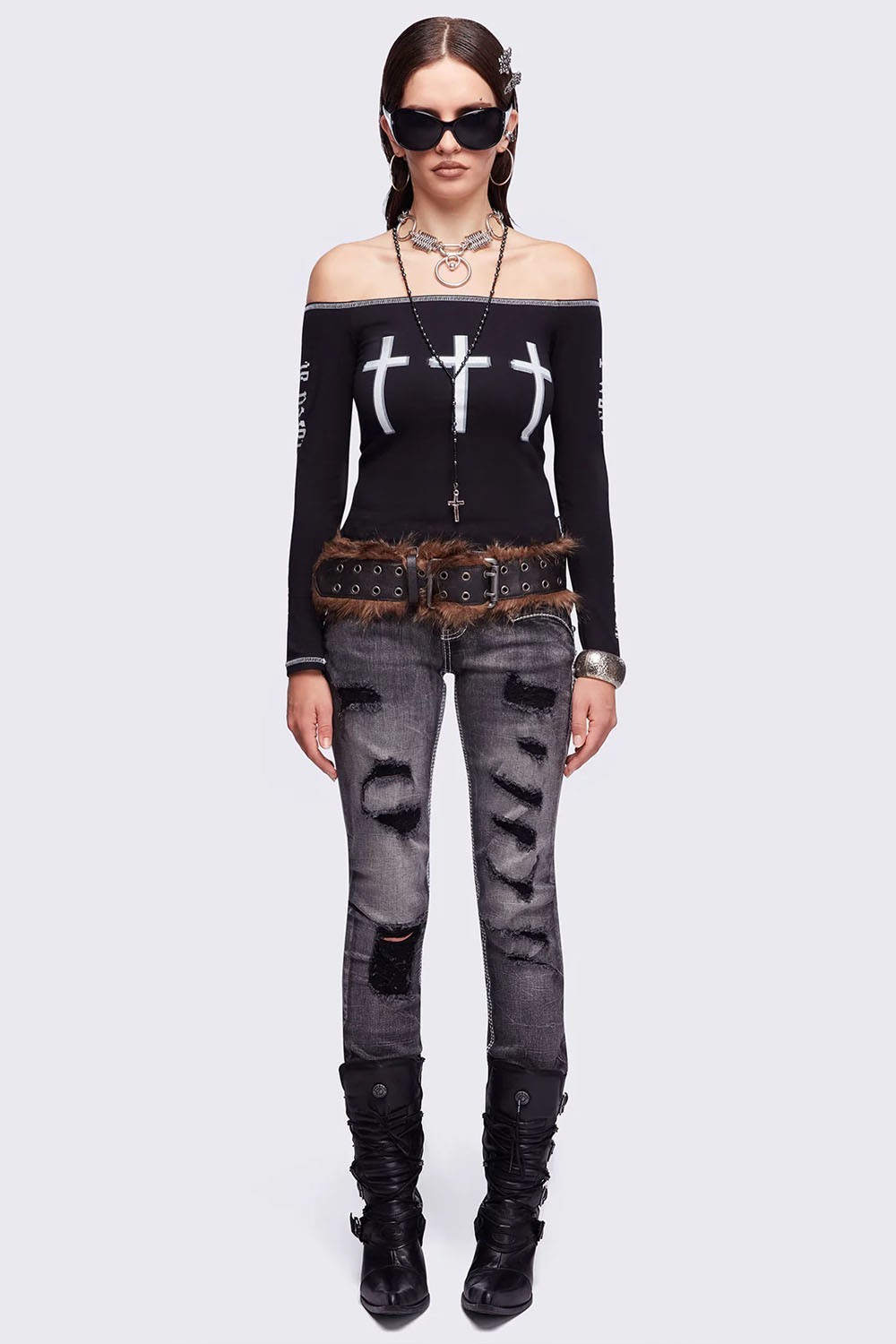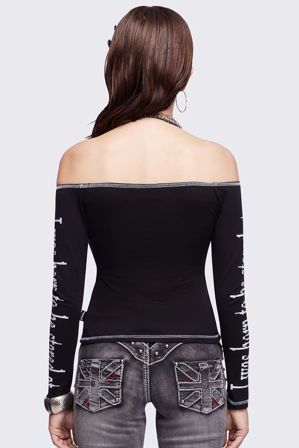 Off-the-shoulder long-sleeved top with a cross print on the front and letter print on the sleeves.