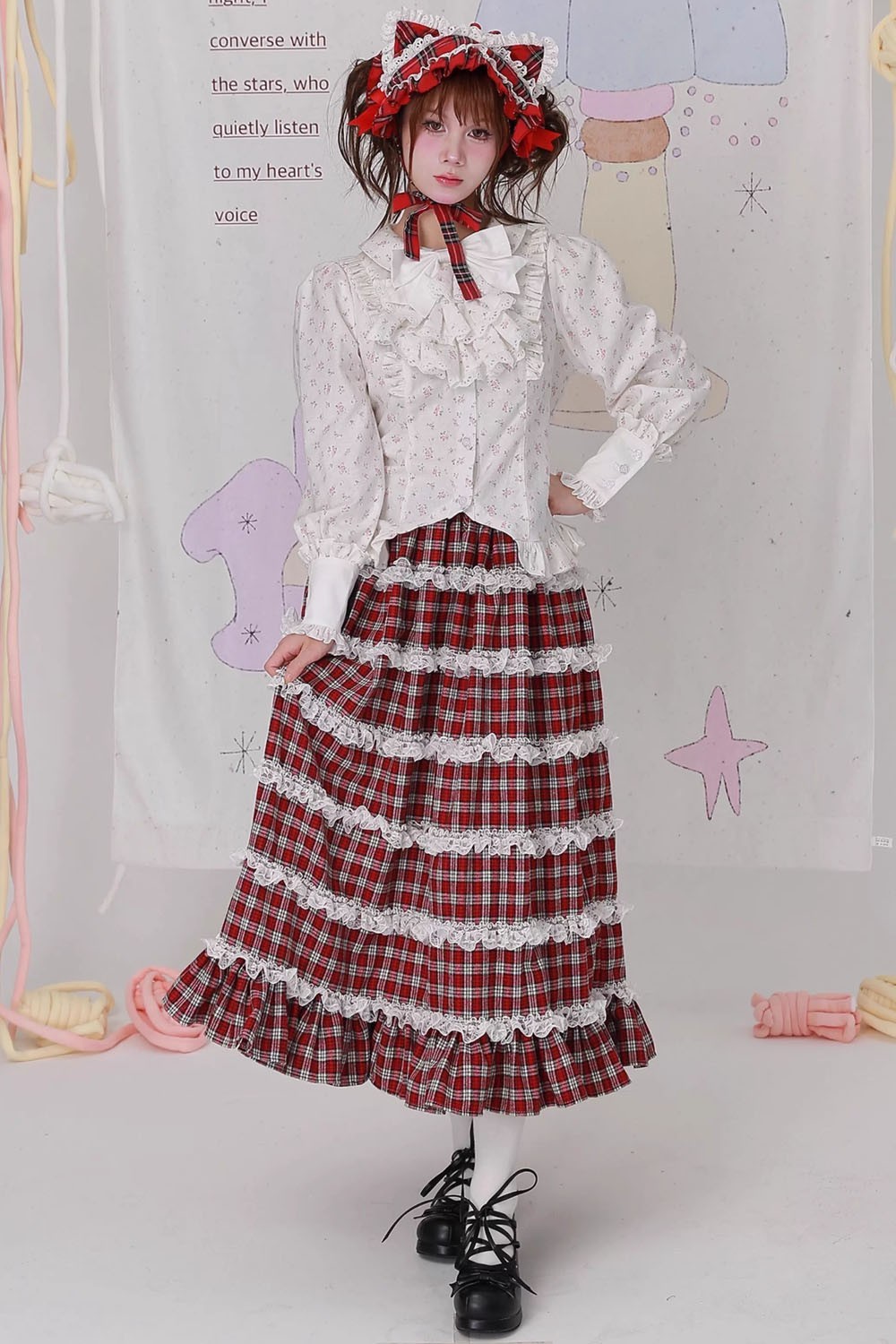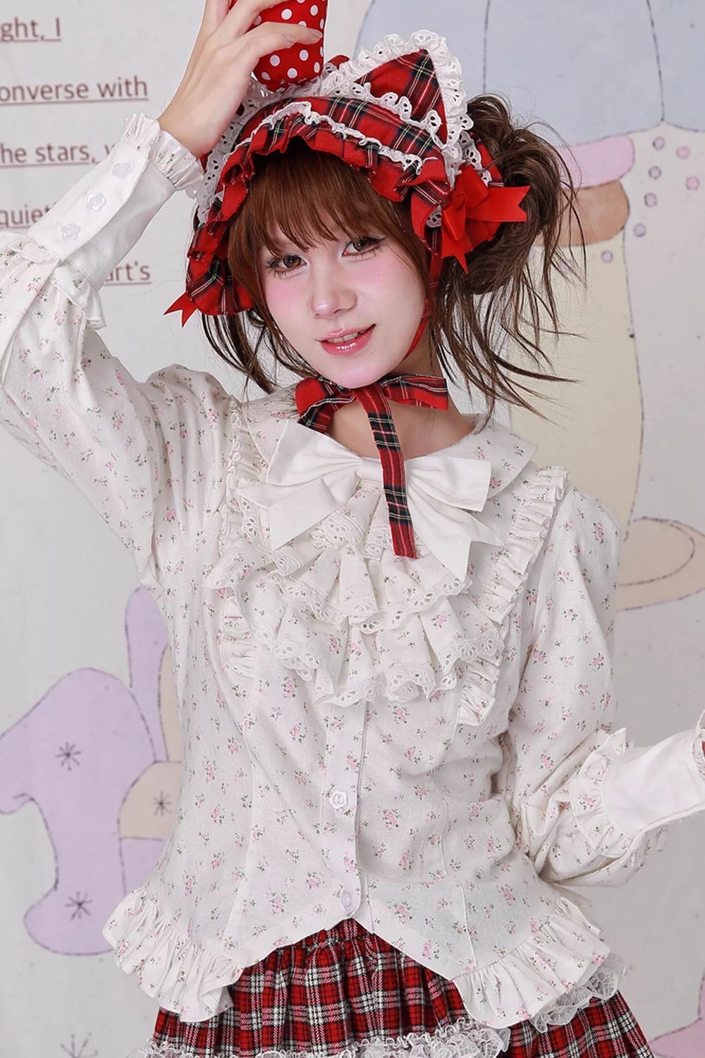 Long-sleeved blouse decorated with bows and lace trim. Elastic and adjutsable ribbons at the back.
