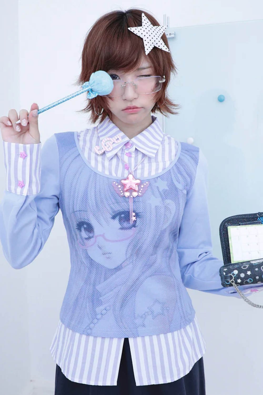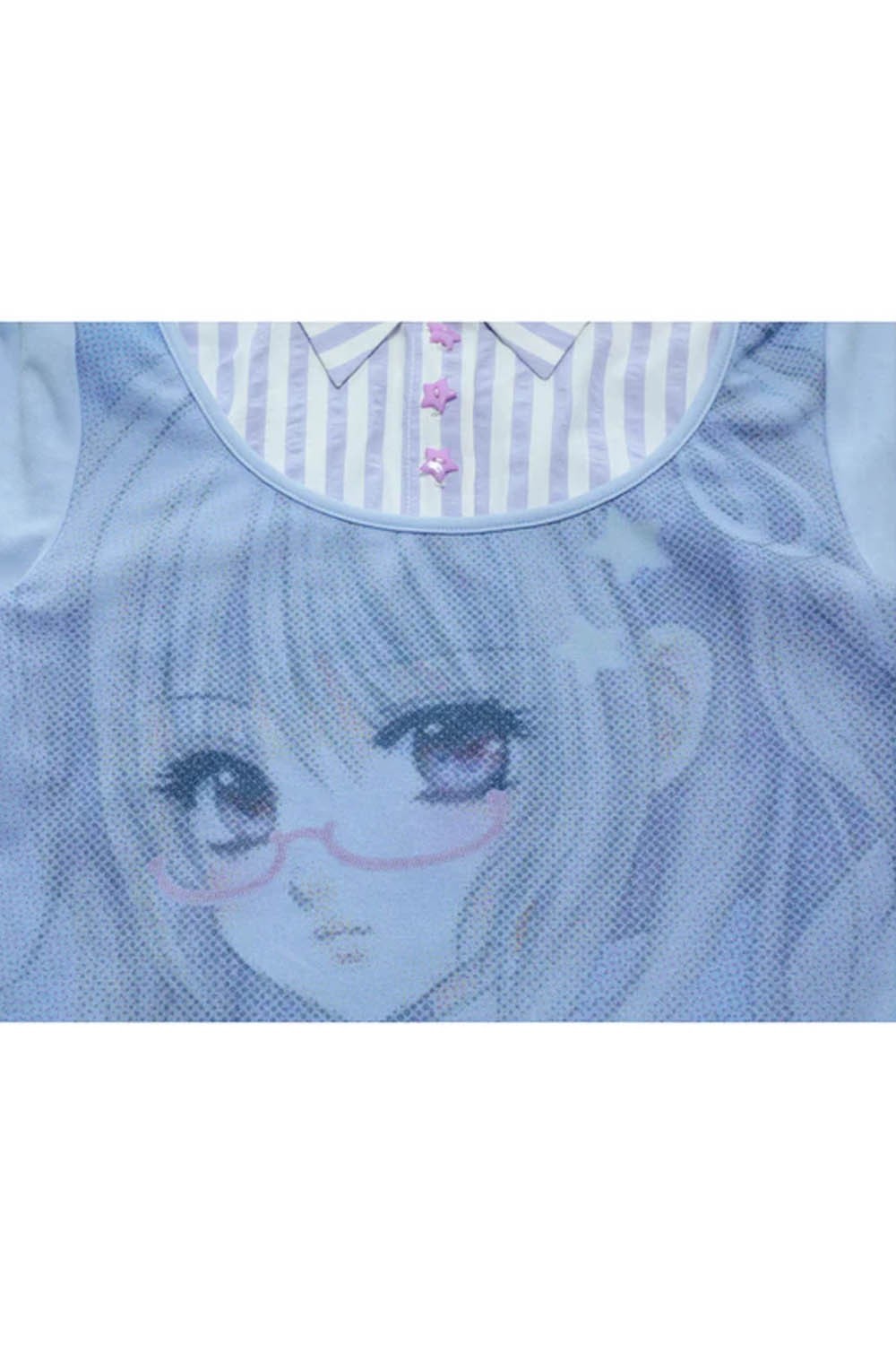 Two-piece effect top with a button-down blouse collar and a front anime girl print.