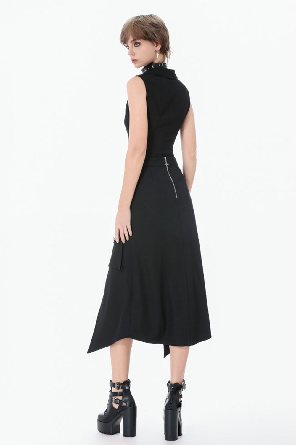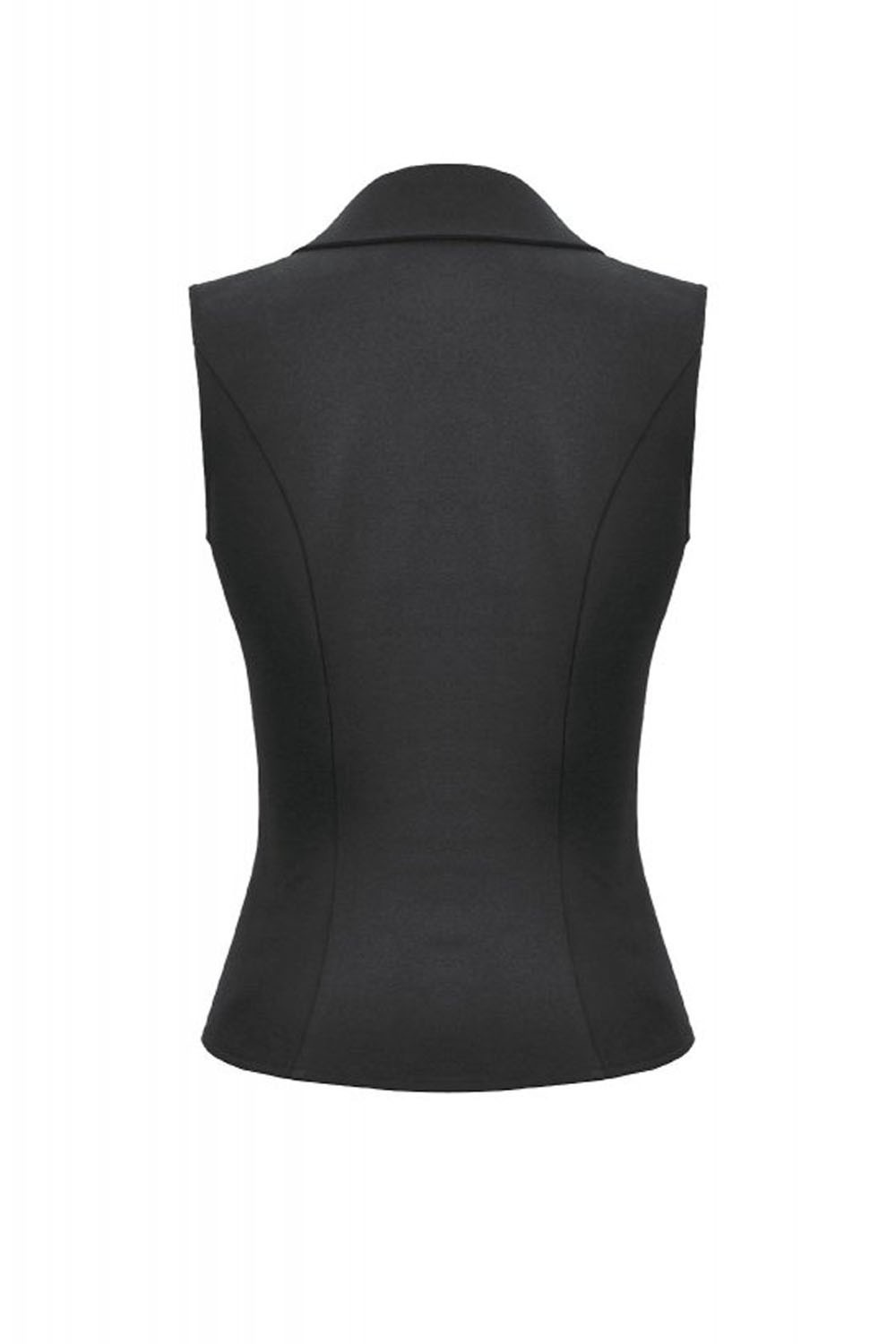 Sleeveless top with front zip closure.