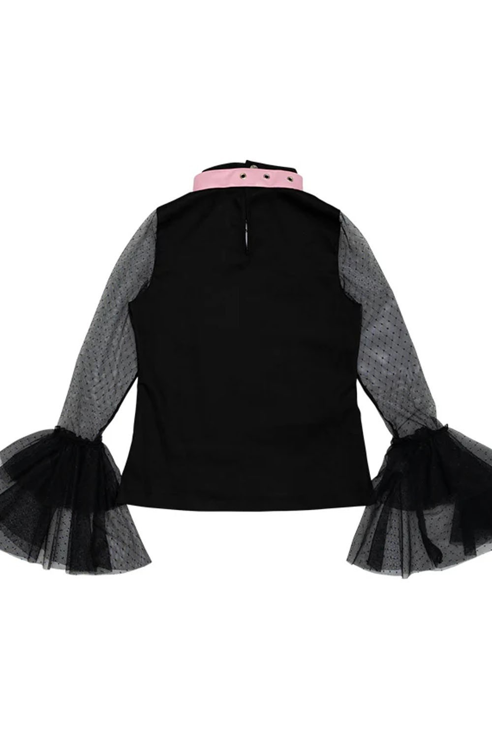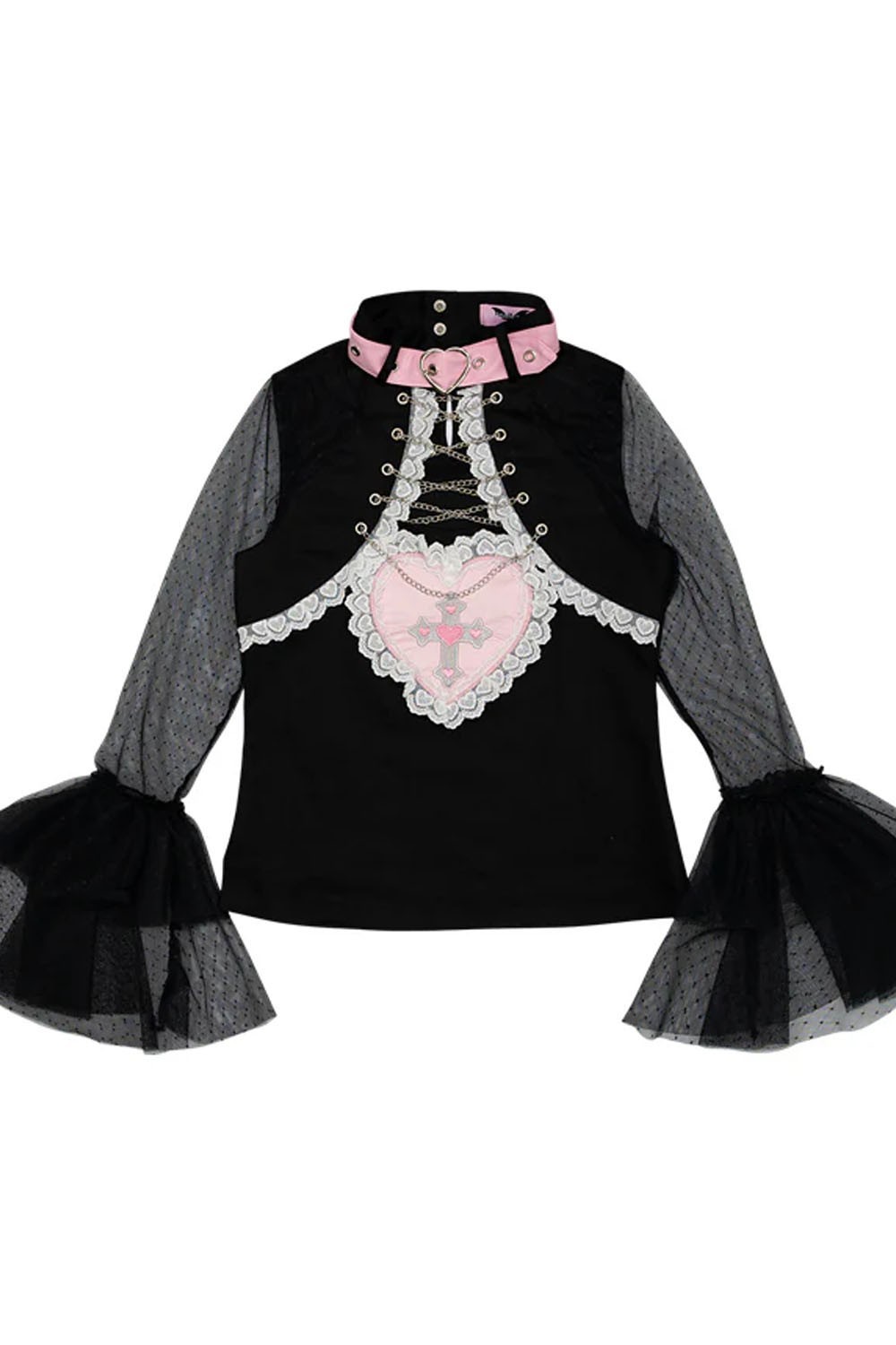 Witch-sleeve turtleneck top with decorative chains and sheer details.