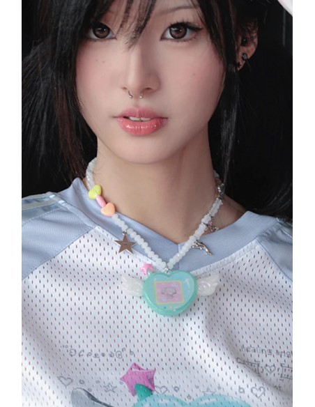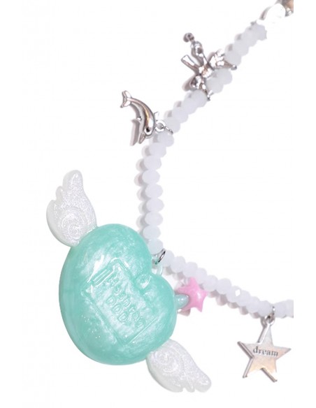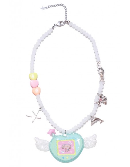 Collar de cuentas con un colgante alado estilo tamagotchi.