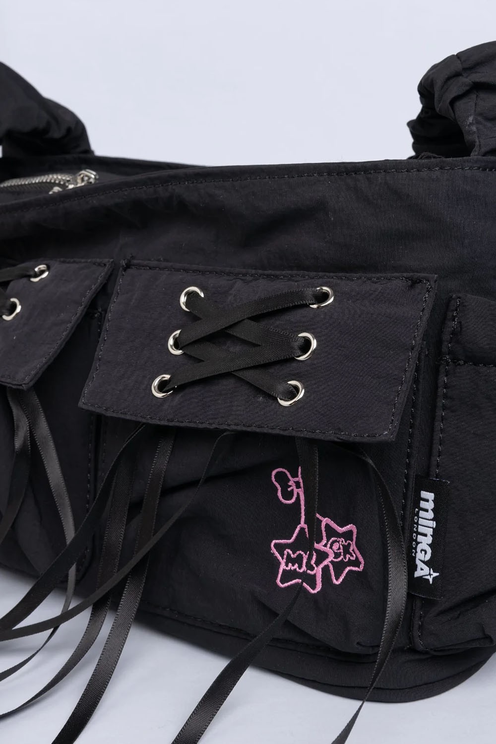 Bolso de nylon con diferentes compartimentos, bordado y charm de Esther Bunny.