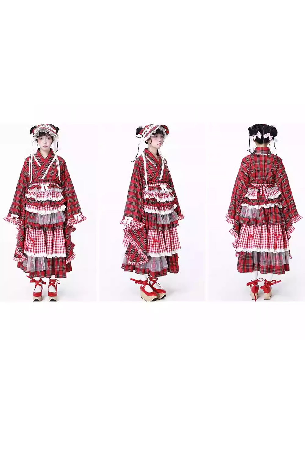Falda larga de tartán y gingham rojo con detalles de encaje y lazos.
