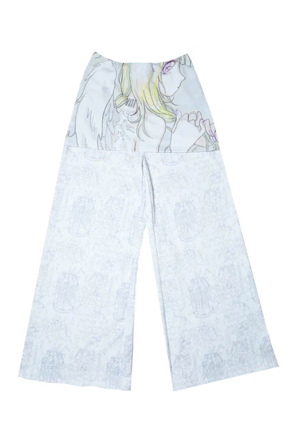 Pantalón estampado con ilustraciones de Oliwabiu y sobrefalda.