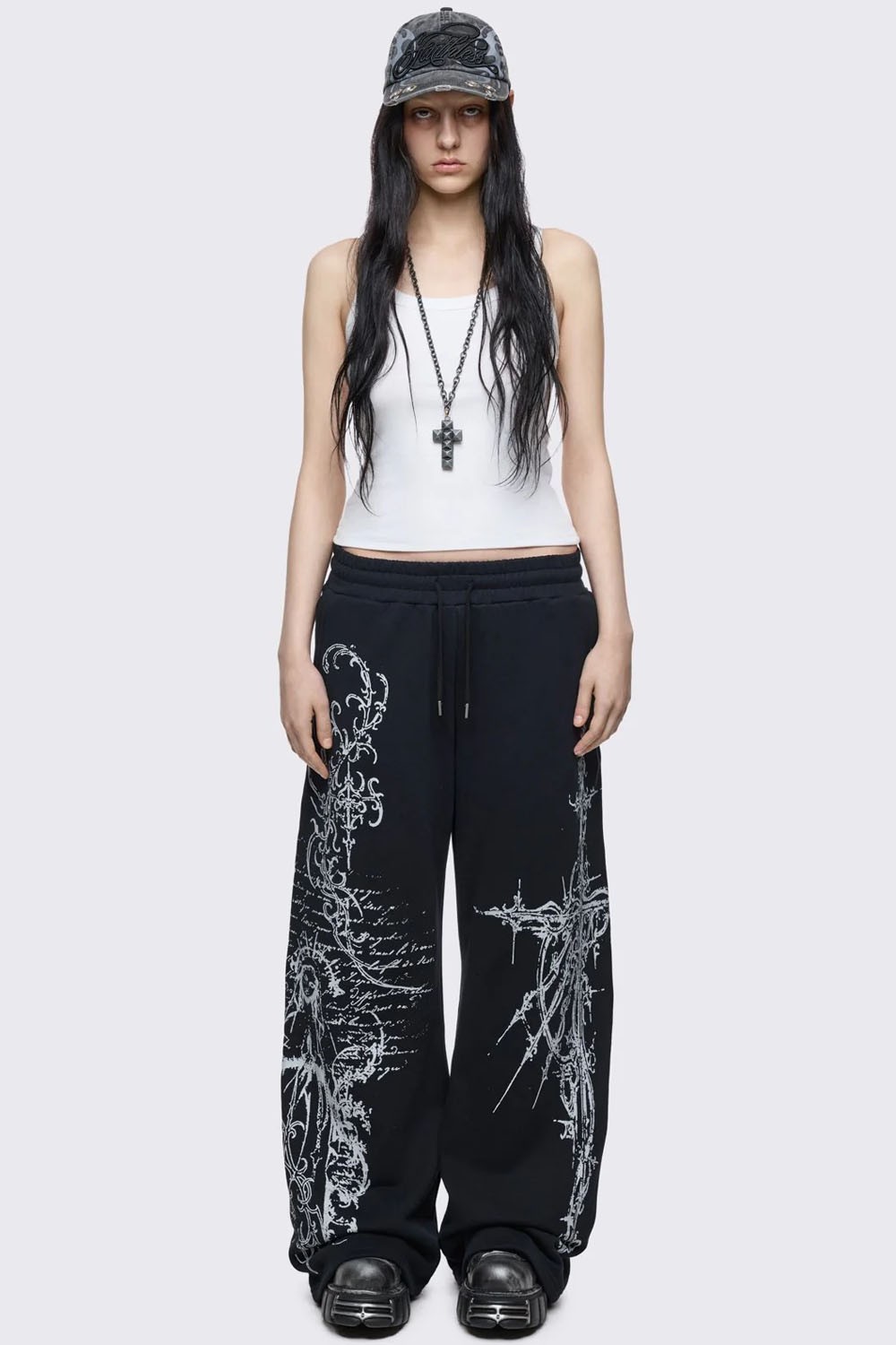 Pantalón deportivo de corte oversized con cintura elástica y decorado de ilustraciones neotribales.