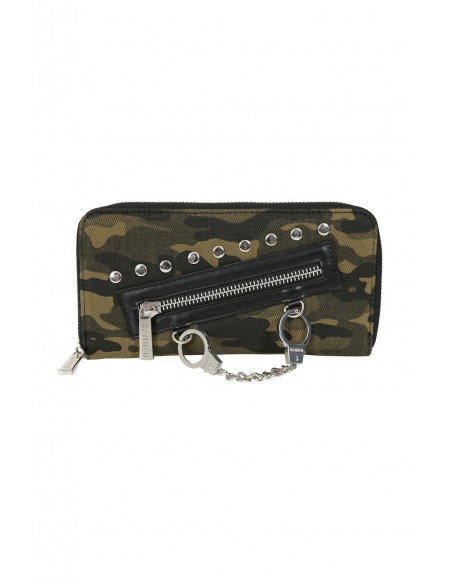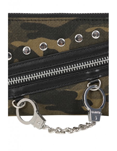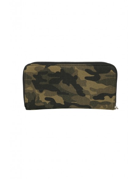 Cartera con tela de algodón con estampado de camuflaje. Cierre de cremallera.