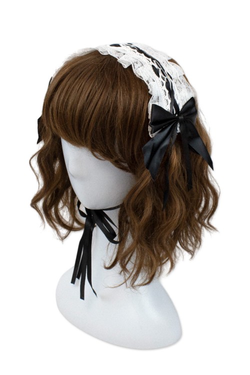 Cofia para la cabeza adornada con lazos y puntilla. Tiene pinzas laterales para mantenerlo más seguro.