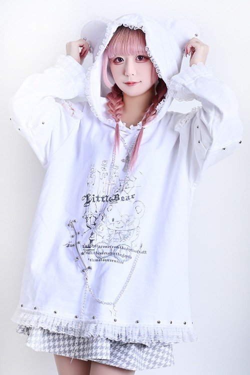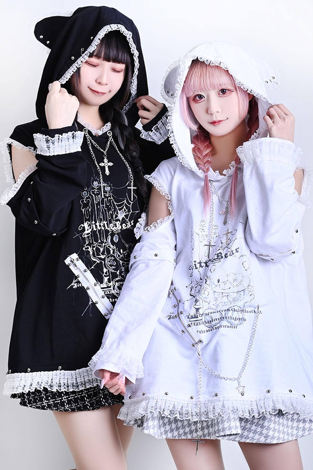 Sudadera oversize con capucha y hombros descubiertos. Adornada con encaje orejas de oso, print y detalles métalicos.