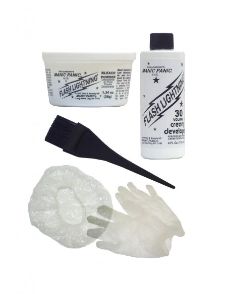 Kit de Decoloración de 30 volúmenes. El pack contiene un sobre de decolorante en polvo de 50 gramos y un bote de peróxido en crema de 30 volúmenes (9%) de 100 ml. Ideal para aclarar cabellos antes de aplicar colores fantasía.