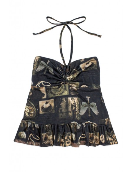 Top estilo halter elástico con estampado digital. Tela de tacto suave.