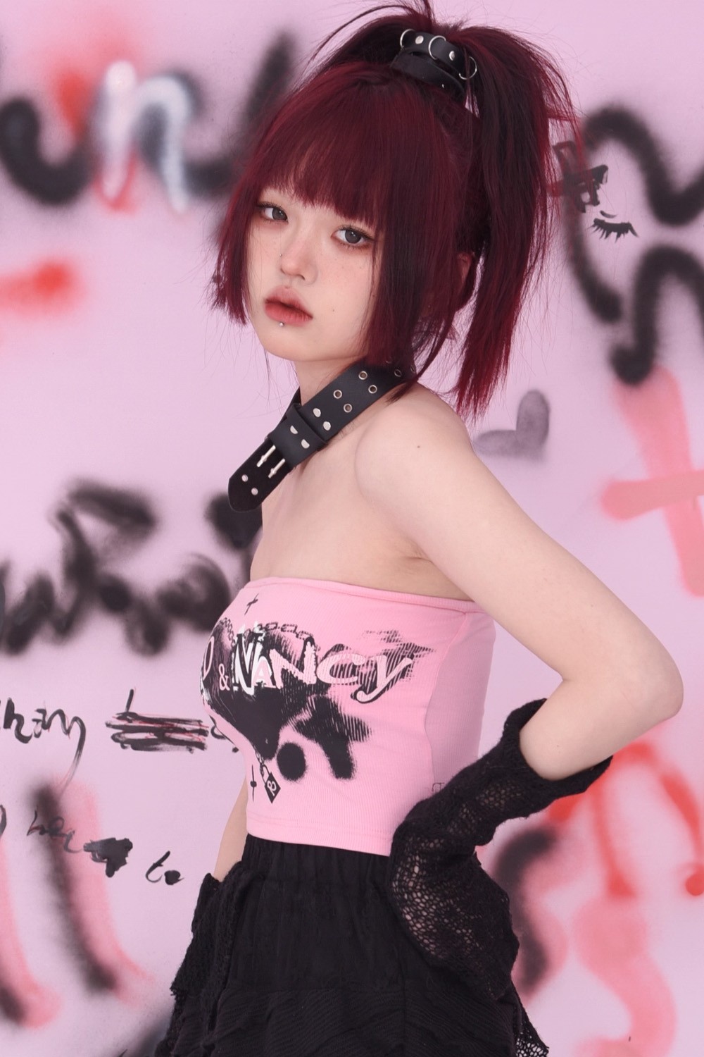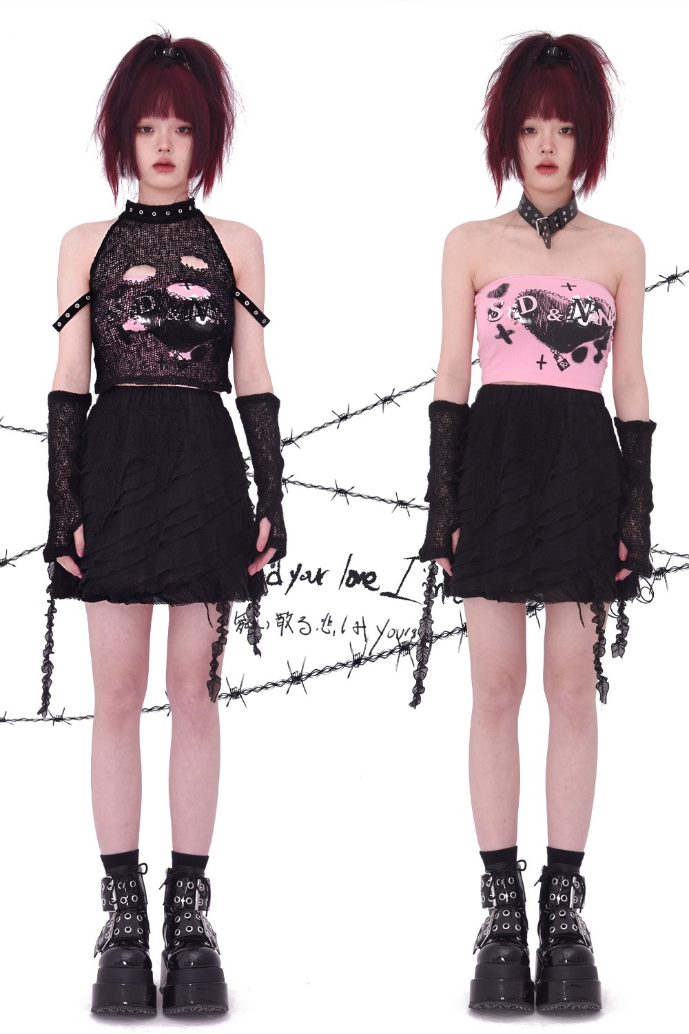 Top de dos piezas: Top interior "Sid&Nancy" sin mangas y sobretop de punto negro con agujetos y cuello de cisne.