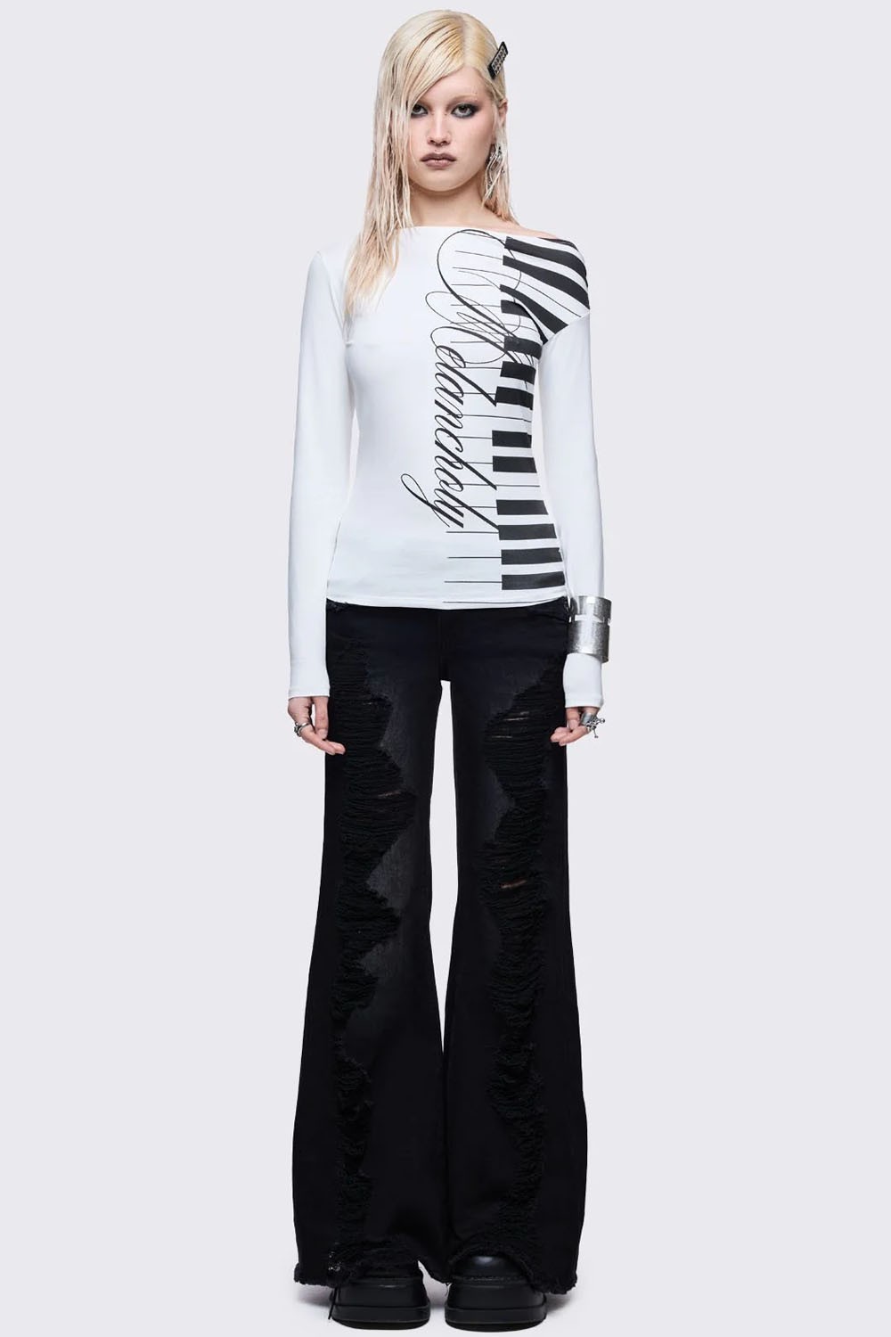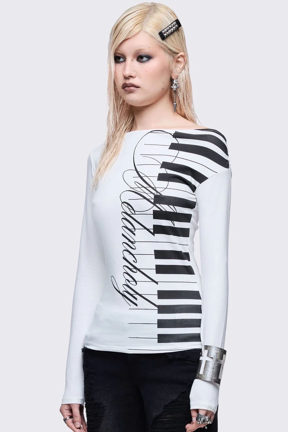 Top de manga larga de hombro descubierto con motivo de piano.