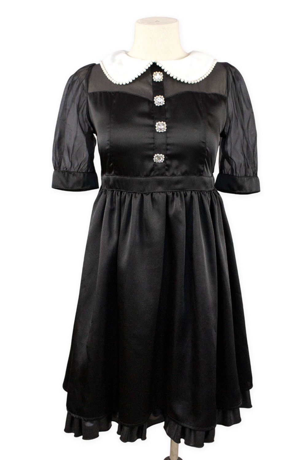 Vestido OP de cuello de peter pan con pedrerñia frontal y cuentas en cuello.