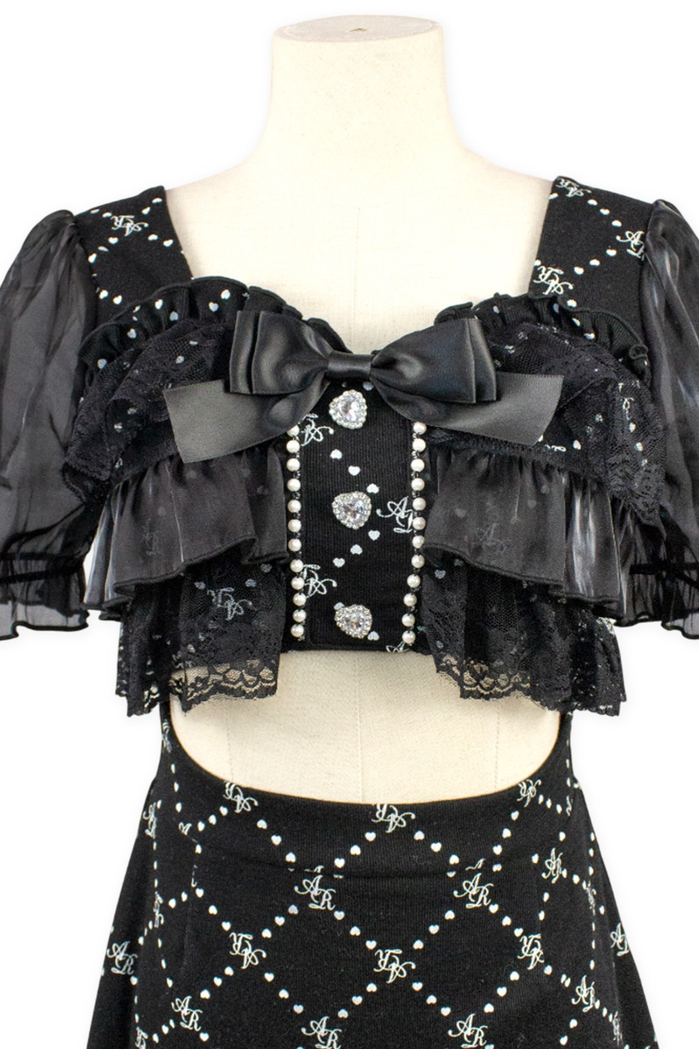 Vestido con pedrería y puntilla con torso parcialment descubierto.
