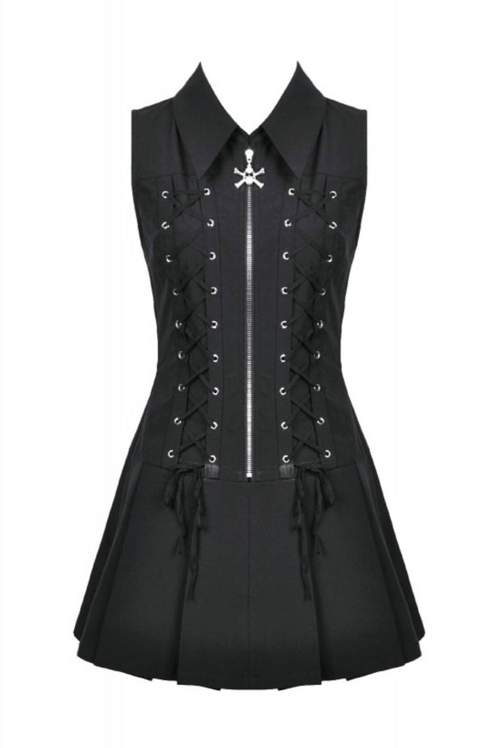 Vestido sin mangas con detalles metálicos y cierre frontal con cremallera.